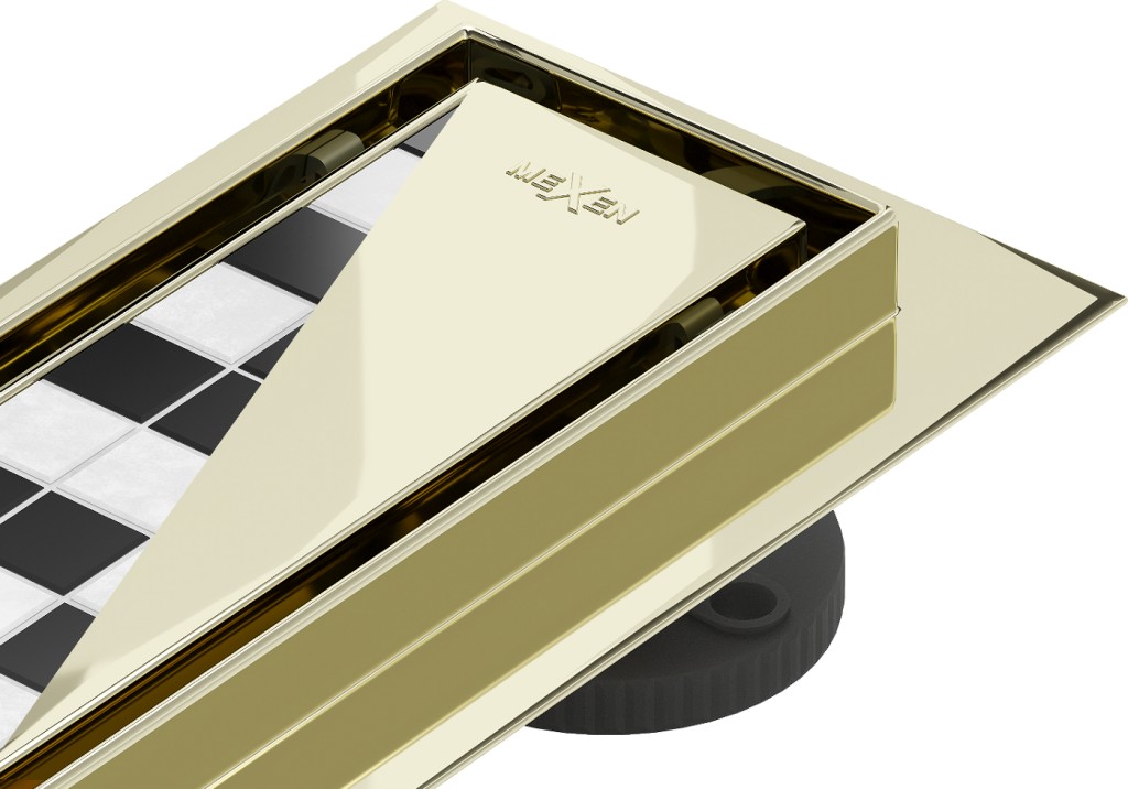 Technická data: Materiál: nerezová ocel AISI 304 Povrchová úprava: zlatá Šířka: 80 cm Sifon otočný o 360° Montážní hloubka: 52 mm Průtok: 50 l/min Mřížka pro lepení obkladů a dlažeb o šířce 50 mm Žlab a rošt o tloušťce 1,2 mm Zavinovací límec - 2 cm Hloubka roštu - 12 mm Zahrnuta: Oboustranná krycí deska s tlumícími distančními vložkami Vyjímatelný filtr na nečistoty Rotační zápachová uzávěrka Žlab pro odvod vody Nastavitelné nožičky Redukce 50/40 mm Těsnící manžeta Háček pro sejmutí masky