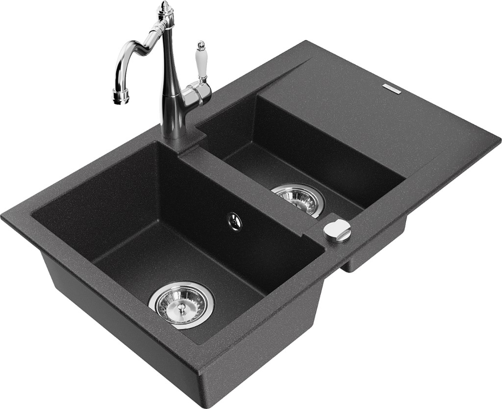 Technická data: dřez: Rozměr: 737x475x177mm Hloubka komory: 167 mm (větší), 107 mm (menší) Rozměry komory: 395x272 mm (větší), (menší) 375x182 mm Průměr odtoku: ø90 mm Typ: 1,5-miska s krátkým odkapávačem Typ: Zapuštěné do pracovní desky Barva: Skvrnitá černá Povrchová úprava sifonu: Chrome Materiál: žula (80 % žulové kamenivo, 20 % pryskyřice) Přepadový otvor: Ano Otvory: (baterie, automatické) 2 Instalace: Univerzální, lze instalovat s odkapávačem na levou nebo pravou stranu Vysoká odolnost proti poškrábání a změně barvy Odolnost proti tepelným šokům Snadno čistitelný povrch kuchyňská baterie: Materiál: mosaz Barva: Chrome Hlava: Keramická Provzdušňovač: Ano Typ: Jedna páka Výška baterie: 290 mm Rozsah výtoku: 260 mm