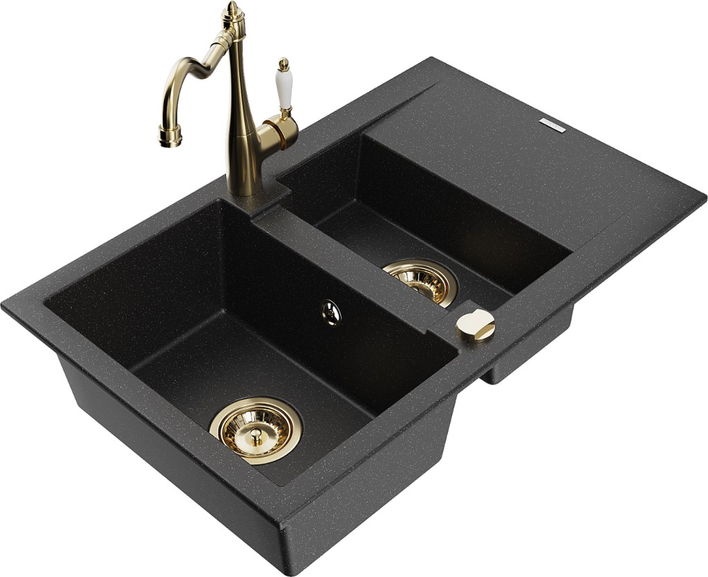 Technická data: dřez: Rozměr: 737x475x177mm Hloubka komory: 167 mm (větší), 107 mm (menší) Rozměry komory: 395x272 mm (větší), (menší) 375x182 mm Průměr odtoku: ø90 mm Typ: 1,5-komorový s krátkým odkapávačem Typ: Zapuštěné do pracovní desky Barva: černá/stříbrná metalíza Povrchová úprava sifonu: zlatá Materiál: žula (80 % žulové kamenivo, 20 % pryskyřice) Přepadový otvor: Ano Otvory: (baterie, automatické) 2 Instalace: Univerzální, lze instalovat s odkapávačem na levou nebo pravou stranu Vysoká odolnost proti poškrábání a změně barvy Odolnost proti tepelným šokům Snadno čistitelný povrch kuchyňská baterie: Materiál: mosaz Barva: Zlatá Hlava: Keramická Provzdušňovač: Ano Typ: Jedna páka Výška baterie: 290 mm Rozsah výtoku: 260 mm