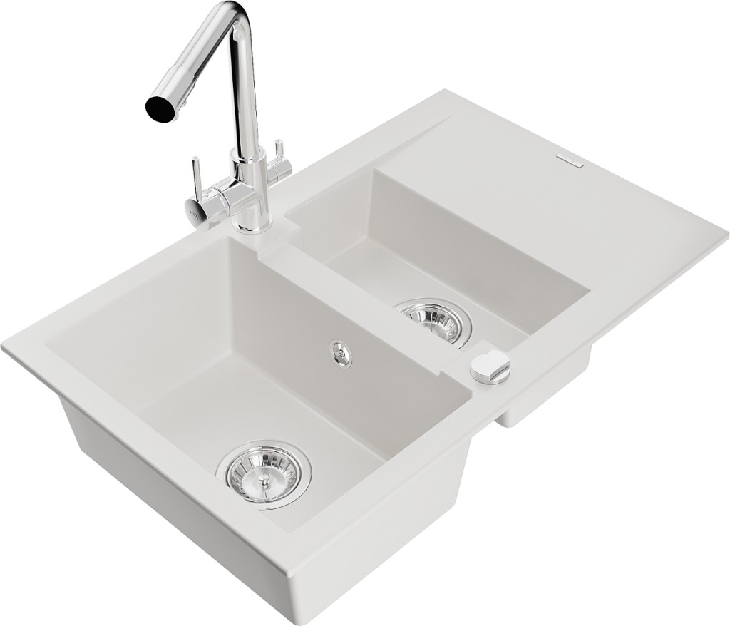 Technická data: dřez: Rozměr: 737x475x177mm Hloubka komory: 167 mm (větší), 107 mm (menší) Rozměry komory: 395x272 mm (větší), (menší) 375x182 mm Průměr odtoku: ø90 mm Typ: 1,5-komorový s krátkým odkapávačem Typ: Zapuštěné do pracovní desky bílá barva Povrchová úprava sifonu: Chrome Materiál: žula (80 % žulové kamenivo, 20 % pryskyřice) Přepadový otvor: Ano Otvory: (baterie, automatické) 2 Instalace: Univerzální, lze instalovat s odkapávačem na levou nebo pravou stranu Vysoká odolnost proti poškrábání a změně barvy Odolnost proti tepelným šokům Snadno čistitelný povrch kuchyňská baterie: Materiál: mosaz Barva: Chrome Hlava: Keramická Provzdušňovač: Ano Typ: Dvě rukojeti Rozsah výtoku: 235 mm Výška baterie: 315 mm Dvouhlavá baterie s přídavným kanálem pro filtrovanou pitnou vodu