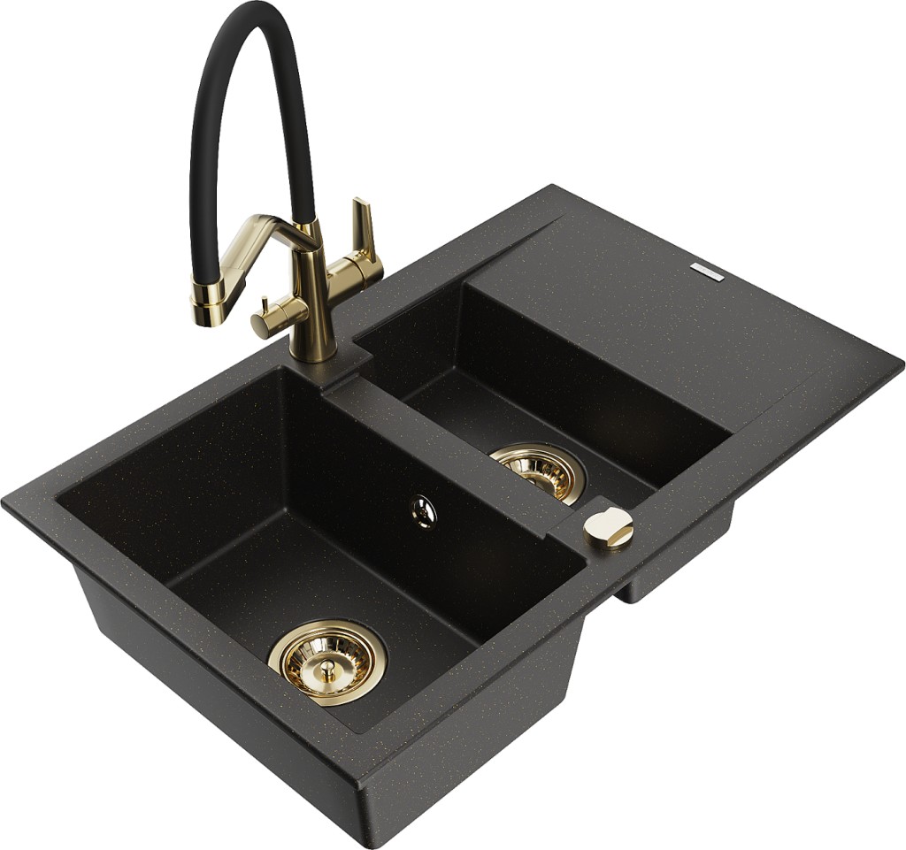 Technická data: dřez: Rozměr: 737x475x177mm Hloubka komory: 167 mm (větší), 107 mm (menší) Rozměry komory: 395x272 mm (větší), (menší) 375x182 mm Průměr odtoku: ø90 mm Typ: 1,5-miska s krátkým odkapávačem Typ: Zapuštěné do pracovní desky Barva: černá/zlatá metalíza Povrchová úprava sifonu: zlatá Materiál: žula (80 % žulové kamenivo, 20 % pryskyřice) Přepadový otvor: Ano Otvory: (baterie, automatické) 2 Instalace: Univerzální, lze instalovat s odkapávačem na levou nebo pravou stranu Vysoká odolnost proti poškrábání a změně barvy Odolnost proti tepelným šokům Snadno čistitelný povrch kuchyňská baterie: Materiál: mosaz Barva: Zlatá/Černá Hlavy: Keramické Provzdušňovač: Ano Typ hubice: Flexibilní s mosazným držákem Rozsah výtoku: 260 mm Výška: 405 mm Typ: Dvě rukojeti Dvouhlavá baterie s přídavným filtrem na pitnou vodu