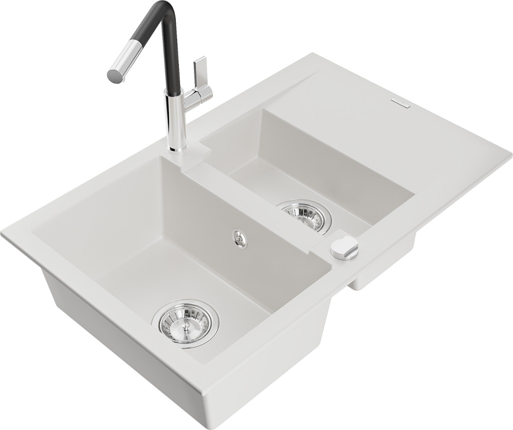 Technická data: dřez: Rozměr: 737x475x177mm Hloubka komory: 167 mm (větší), 107 mm (menší) Rozměry komory: 395x272 mm (větší), (menší) 375x182 mm Průměr odtoku: ø90 mm Typ: 1,5-miska s krátkým odkapávačem Typ: Zapuštěné do pracovní desky bílá barva Povrchová úprava sifonu: Chrome Materiál: žula (80 % žulové kamenivo, 20 % pryskyřice) Přepadový otvor: Ano Otvory: (baterie, automatické) 2 Instalace: Univerzální, lze instalovat s odkapávačem na levou nebo pravou stranu Vysoká odolnost proti poškrábání a změně barvy Odolnost proti tepelným šokům Snadno čistitelný povrch kuchyňská baterie: Materiál: mosaz Barva: chrom/černá Hlava: Keramická Provzdušňovač: Ano Typ: Jedna páka Rozsah výtoku: 245 mm Výška baterie: 307 mm