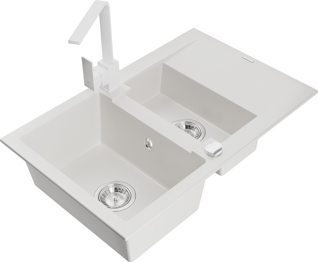 Technická data: dřez: Rozměr: 737x475x177mm Hloubka komory: 167 mm (větší), 107 mm (menší) Rozměry komory: 395x272 mm (větší), (menší) 375x182 mm Průměr odtoku: ø90 mm Typ: 1,5-komorový s krátkým odkapávačem Typ: Zapuštěné do pracovní desky bílá barva Povrchová úprava sifonu: Chrome Materiál: žula (80 % žulové kamenivo, 20 % pryskyřice) Přepadový otvor: Ano Otvory: (baterie, automatické) 2 Instalace: Univerzální, lze instalovat s odkapávačem na levou nebo pravou stranu Vysoká odolnost proti poškrábání a změně barvy Odolnost proti tepelným šokům Snadno čistitelný povrch kuchyňská baterie: Materiál: mosaz bílá barva Hlava: Keramická Provzdušňovač: Ano Typ: Jedna páka Výška baterie: 300 mm