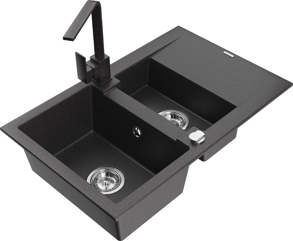 Technická data: dřez: Rozměr: 737x475x177mm Hloubka komory: 167 mm (větší), 107 mm (menší) Rozměry komory: 395x272 mm (větší), (menší) 375x182 mm Průměr odtoku: ø90 mm Typ: 1,5-miska s krátkým odkapávačem Typ: Zapuštěné do pracovní desky Barva: Skvrnitá černá Povrchová úprava sifonu: Chrome Materiál: žula (80 % žulové kamenivo, 20 % pryskyřice) Přepadový otvor: Ano Otvory: (baterie, automatické) 2 Instalace: Univerzální, lze instalovat s odkapávačem na levou nebo pravou stranu Vysoká odolnost proti poškrábání a změně barvy Odolnost proti tepelným šokům Snadno čistitelný povrch kuchyňská baterie: Materiál: mosaz Barva: Skvrnitá černá Hlava: Keramická Provzdušňovač: Ano Typ: Jedna páka Výška baterie: 290 mm Rozsah výtoku: 220 mm