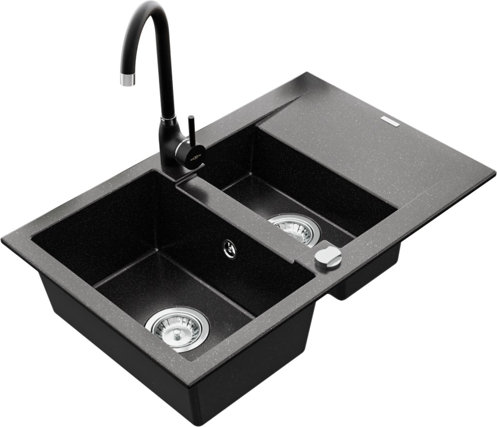 Technická data: dřez: Rozměr: 737x475x177mm Hloubka komory: 167 mm (větší), 107 mm (menší) Rozměry komory: 395x272 mm (větší), (menší) 375x182 mm Průměr odtoku: ø90 mm Typ: 1,5-komorový s krátkým odkapávačem Typ: Zapuštěné do pracovní desky Barva: černá/stříbrná metalíza Povrchová úprava sifonu: Chrome Materiál: žula (80 % žulové kamenivo, 20 % pryskyřice) Přepadový otvor: Ano Otvory: (baterie, automatické) 2 Instalace: Univerzální, lze instalovat s odkapávačem na levou nebo pravou stranu Vysoká odolnost proti poškrábání a změně barvy Odolnost proti tepelným šokům Snadno čistitelný povrch kuchyňská baterie: Materiál: mosaz Černá barva Hlava: Keramická Provzdušňovač: Ano Výška baterie: 335 mm Rozsah výtoku: 180 mm