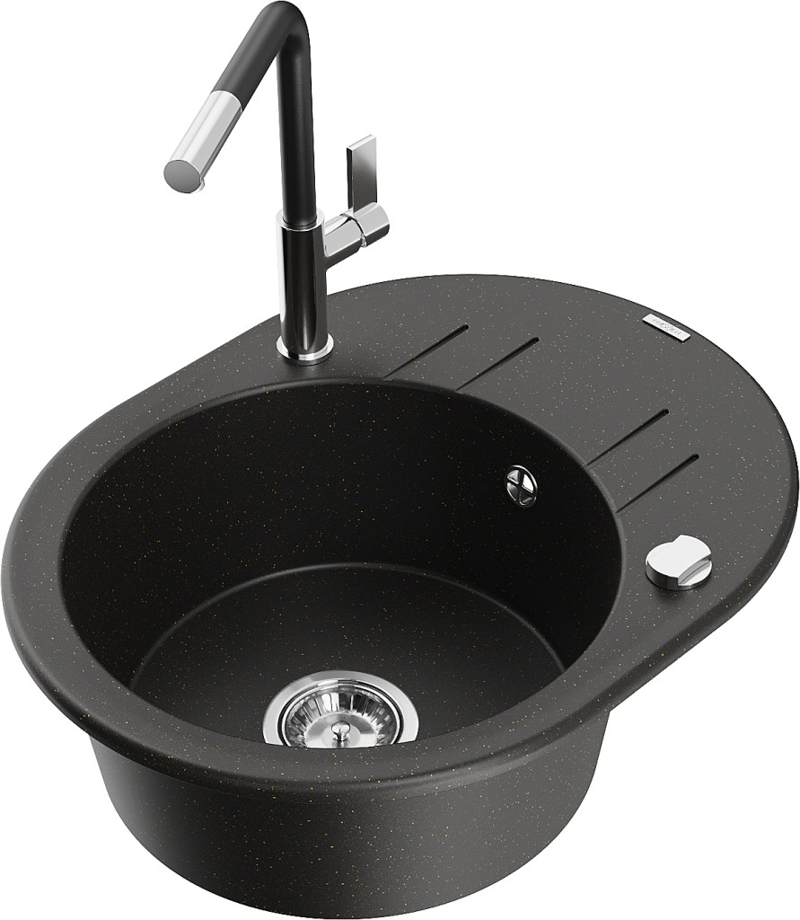 Technické údaje: Kuchyňský dřez: Rozměry: 586x458x190 mm Hloubka komory: 180 mm Šířka komory: 378x374 mm Průměr odtoku: ø90 mm Typ: 1 dřez s krátkým odkapávačem Typ: Zapuštěný Barva: Černá/Zlatá metalíza Povrchová úprava sifonu: Chrom Materiál: Žula (80 % žulového kameniva, 20 % pryskyřic) Přepadový otvor: Ano Otvory: (bateriové, automatické) 2 Instalace: Univerzální, lze instalovat s odtokem na levé nebo pravé straně Vysoká odolnost proti poškrábání a zabarvení Odolnost proti tepelným šokům Snadno čistitelný povrch Dva další frézované otvory pro samoděrování ø35 Kuchyňská baterie: Materiál: Mosaz Barva: Chrom/Černá Hlava: Keramika Provzdušňovač: Ano Typ: Jednopákový Dosah výtoku: 245 mm Výška baterie: 307 mm