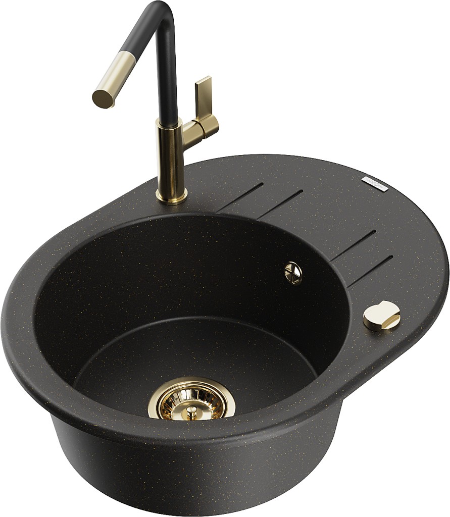 Technické údaje: Kuchyňský dřez: Rozměry: 586x458x190 mm Hloubka komory: 180 mm Šířka komory: 378x374 mm Průměr odtoku: ø90 mm Typ: 1 dřez s krátkým odkapávačem Typ: Zapuštěný Barva: Černá/Zlatá metalíza Povrchová úprava sifonu: Zlatá Materiál: Žula (80 % žulového kameniva, 20 % pryskyřic) Přepadový otvor: Ano Otvory: (bateriové, automatické) 2 Instalace: Univerzální, lze instalovat s odtokem na levé nebo pravé straně Vysoká odolnost proti poškrábání a zabarvení Odolnost proti tepelným šokům Snadno čistitelný povrch Dva další frézované otvory pro samoděrování ø35 Kuchyňská baterie: Materiál: Mosaz Barva: Zlatá/Černá Hlava: Keramika Provzdušňovač: Ano Typ: Jednopákový Dosah výtoku: 245 mm Výška baterie: 307 mm