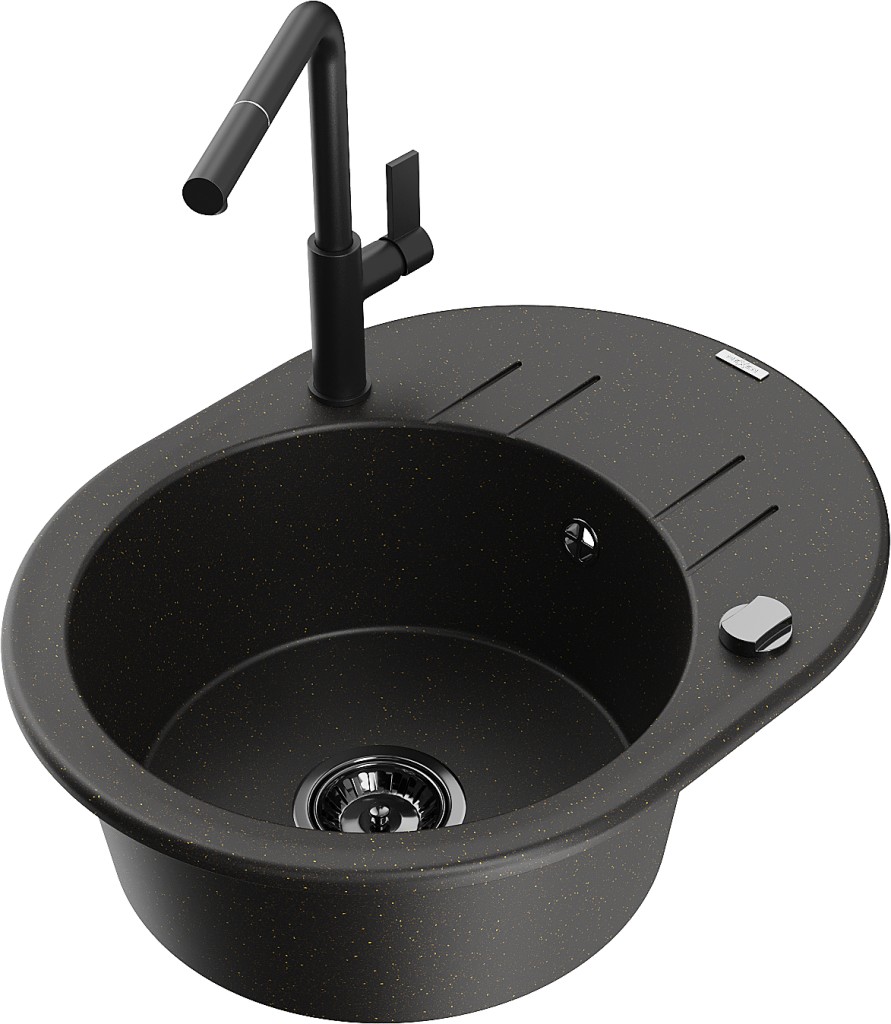 Technické údaje: Kuchyňský dřez: Rozměry: 586x458x190 mm Hloubka komory: 180 mm Šířka komory: 378x374 mm Průměr odtoku: ø90 mm Typ: 1 dřez s krátkým odkapávačem Typ: Zapuštěný Barva: Černá/Zlatá metalíza Povrchová úprava sifonu: Černá Materiál: Žula (80 % žulového kameniva, 20 % pryskyřic) Přepadový otvor: Ano Otvory: (bateriové, automatické) 2 Instalace: Univerzální, lze instalovat s odtokem na levé nebo pravé straně Vysoká odolnost proti poškrábání a zabarvení Odolnost proti tepelným šokům Snadno čistitelný povrch Dva další frézované otvory pro samoděrování ø35 Kuchyňská baterie: Materiál: Mosaz Barva: Černá Hlava: Keramika Provzdušňovač: Ano Typ: Jednopákový Dosah výtoku: 245 mm Výška baterie: 307 mm
