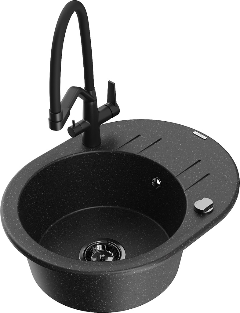 Technická data: dřez: Rozměr: 586 x 458 x 190 mm Hloubka komory: 180 mm Šířka komory: 378x374 mm Průměr odtoku: ø90 mm Typ: 1-miska s krátkým odkapávačem Typ: Zapuštěné do pracovní desky Barva: černá/stříbrná metalíza Povrchová úprava sifonu: černá Materiál: žula (80 % žulové kamenivo, 20 % pryskyřice) Přepadový otvor: Ano Otvory: (baterie, automatické) 2 Instalace: Univerzální, lze instalovat s odkapávačem na levou nebo pravou stranu Vysoká odolnost proti poškrábání a změně barvy Odolnost proti tepelným šokům Snadno čistitelný povrch Dva dodatečné vyfrézované otvory pro samoděrování ø35 kuchyňská baterie: Materiál: mosaz Černá barva Hlavy: Keramické Provzdušňovač: Ano Typ hubice: Flexibilní s mosazným držákem Rozsah výtoku: 260 mm Výška: 405 mm Typ: Dvě rukojeti Dvouhlavá baterie s přídavným filtrem na pitnou vodu