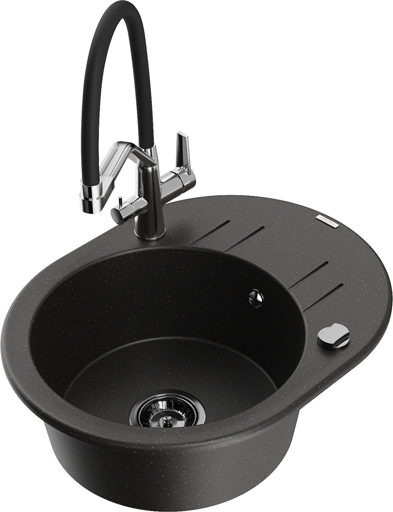 Technické údaje: Kuchyňský dřez: Rozměry: 586x458x190 mm Hloubka komory: 180 mm Šířka komory: 378x374 mm Průměr odtoku: ø90 mm Typ: 1 dřez s krátkým odkapávačem Typ: Zapuštěný Barva: Černá/Zlatá metalíza Povrchová úprava sifonu: Černá Materiál: Žula (80 % žulového kameniva, 20 % pryskyřic) Přepadový otvor: Ano Otvory: (bateriové, automatické) 2 Instalace: Univerzální, lze instalovat s odtokem na levé nebo pravé straně Vysoká odolnost proti poškrábání a zabarvení Odolnost proti tepelným šokům Snadno čistitelný povrch Dva další frézované otvory pro samoděrování ø35 Kuchyňská baterie: Materiál: Mosaz Barva: Chrom/Černá Hlavy: Keramické Provzdušňovač: Ano Typ výtoku: Flexibilní s mosaznou podpěrou Dosah výtoku: 260 mm Výška: 405 mm Typ: Dvoupákový Dvouhlavý kohoutek s přídavným filtrem na pitnou vodu