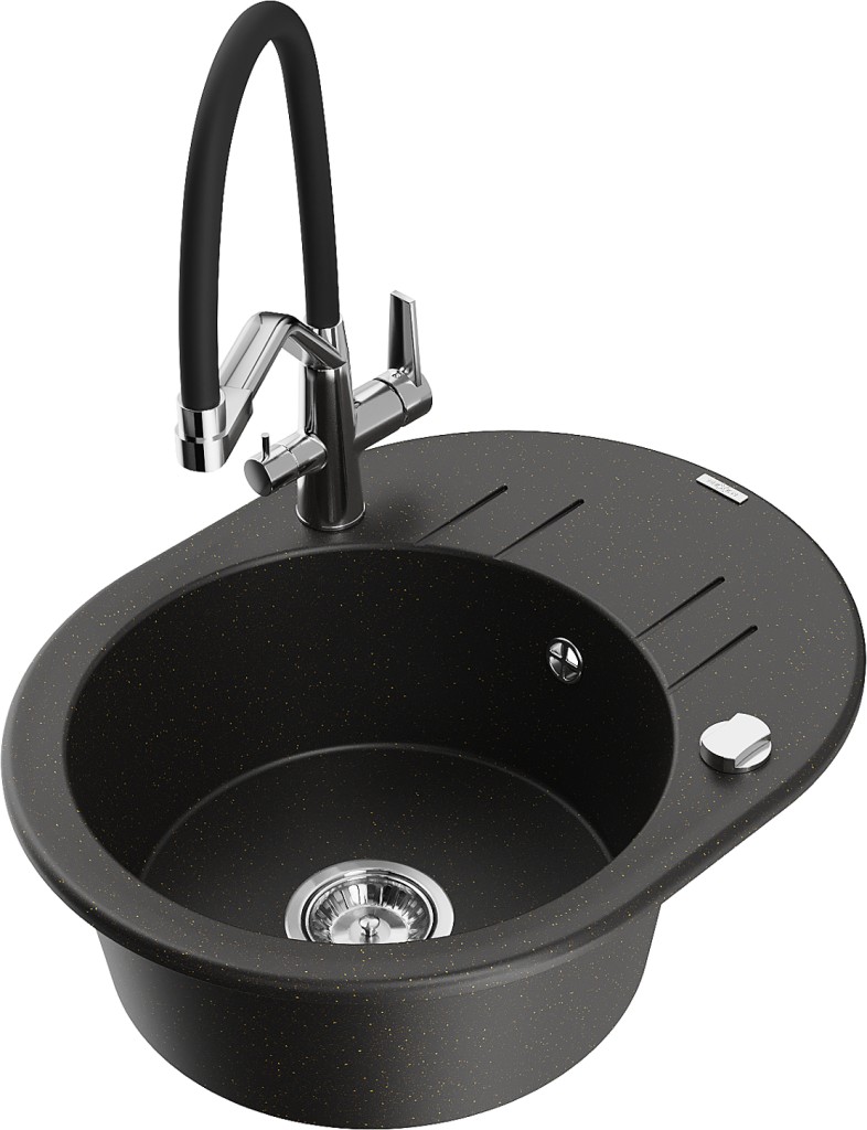 Technické údaje: Kuchyňský dřez: Rozměry: 586x458x190 mm Hloubka komory: 180 mm Šířka komory: 378x374 mm Průměr odtoku: ø90 mm Typ: 1 dřez s krátkým odkapávačem Typ: Zapuštěný Barva: Černá/Zlatá metalíza Povrchová úprava sifonu: Chrom Materiál: Žula (80 % žulového kameniva, 20 % pryskyřic) Přepadový otvor: Ano Otvory: (bateriové, automatické) 2 Instalace: Univerzální, lze instalovat s odtokem na levé nebo pravé straně Vysoká odolnost proti poškrábání a zabarvení Odolnost proti tepelným šokům Snadno čistitelný povrch Dva další frézované otvory pro samoděrování ø35 Kuchyňská baterie: Materiál: Mosaz Barva: Chrom/Černá Hlavy: Keramické Provzdušňovač: Ano Typ výtoku: Flexibilní s mosaznou podpěrou Dosah výtoku: 260 mm Výška: 405 mm Typ: Dvoupákový Dvouhlavý kohoutek s přídavným filtrem na pitnou vodu