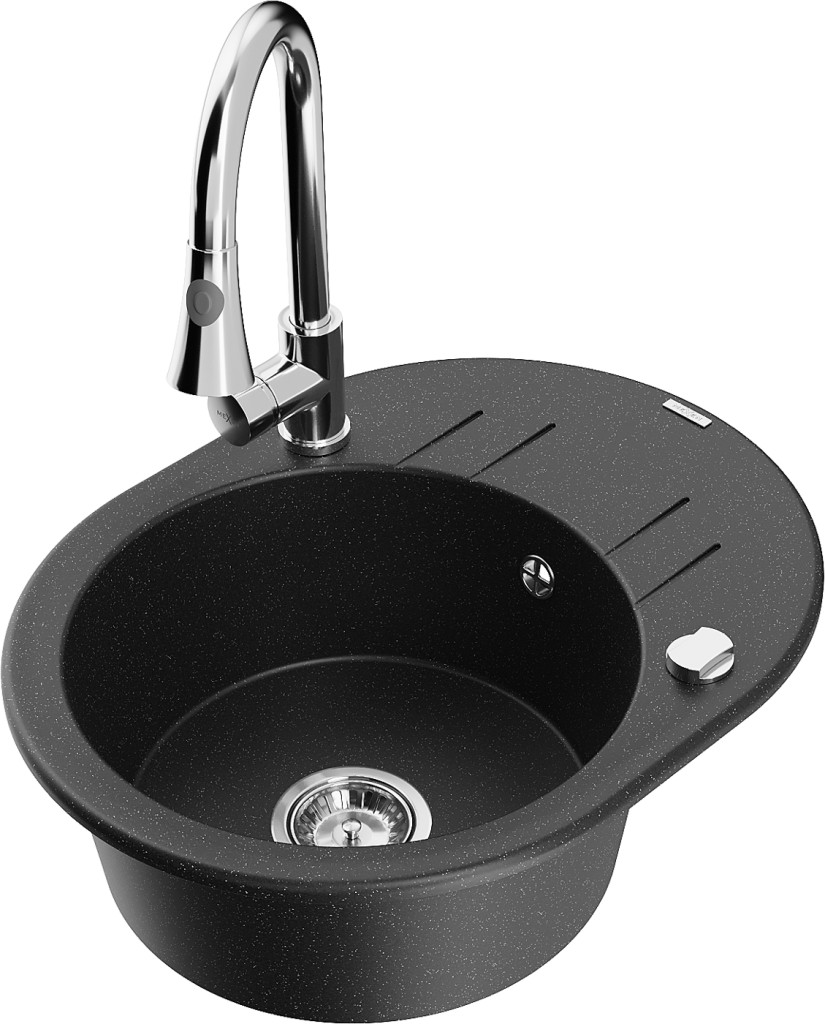 Technická data: dřez: Rozměr: 586 x 458 x 190 mm Hloubka komory: 180 mm Šířka komory: 378x374 mm Průměr odtoku: ø90 mm Typ: 1-miska s krátkým odkapávačem Typ: Zapuštěné do pracovní desky Barva: černá/stříbrná metalíza Povrchová úprava sifonu: Chrome Materiál: žula (80 % žulové kamenivo, 20 % pryskyřice) Přepadový otvor: Ano Otvory: (baterie, automatické) 2 Instalace: Univerzální, lze instalovat s odkapávačem na levou nebo pravou stranu Vysoká odolnost proti poškrábání a změně barvy Odolnost proti tepelným šokům Snadno čistitelný povrch Dva dodatečné vyfrézované otvory pro samoděrování ø35 kuchyňská baterie: Materiál: mosaz Barva: Chrome Hlava: Keramická Provzdušňovač: Ano Typ: Jedna páka Výška baterie: 380 mm Rozsah výtoku: 252 mm Typ výtoku: Výsuvný