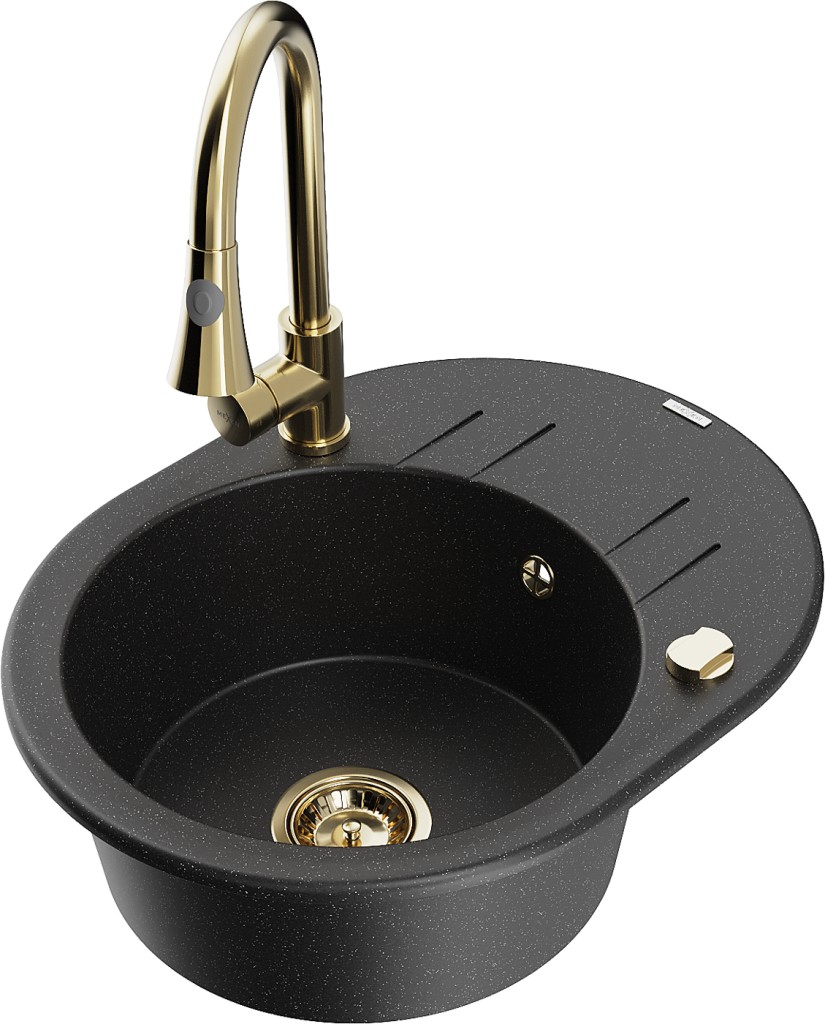 Technická data: dřez: Rozměr: 586 x 458 x 190 mm Hloubka komory: 180 mm Šířka komory: 378x374 mm Průměr odtoku: ø90 mm Typ: 1-miska s krátkým odkapávačem Typ: Zapuštěné do pracovní desky Barva: černá/stříbrná metalíza Povrchová úprava sifonu: zlatá Materiál: žula (80 % žulové kamenivo, 20 % pryskyřice) Přepadový otvor: Ano Otvory: (baterie, automatické) 2 Instalace: Univerzální, lze instalovat s odkapávačem na levou nebo pravou stranu Vysoká odolnost proti poškrábání a změně barvy Odolnost proti tepelným šokům Snadno čistitelný povrch Dva dodatečné vyfrézované otvory pro samoděrování ø35 kuchyňská baterie: Materiál: mosaz Barva: Zlatá Hlava: Keramická Provzdušňovač: Ano Typ: Jedna páka Výška baterie: 380 mm Rozsah výtoku: 252 mm Typ výtoku: Výsuvný