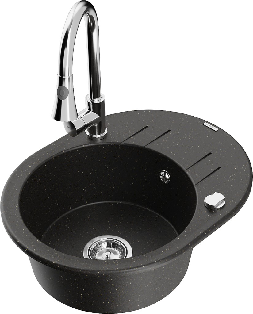 Technické údaje: Kuchyňský dřez: Rozměry: 586x458x190 mm Hloubka komory: 180 mm Šířka komory: 378x374 mm Průměr odtoku: ø90 mm Typ: 1 dřez s krátkým odkapávačem Typ: Zapuštěný Barva: Černá/Zlatá metalíza Povrchová úprava sifonu: Chrom Materiál: Žula (80 % žulového kameniva, 20 % pryskyřic) Přepadový otvor: Ano Otvory: (bateriové, automatické) 2 Instalace: Univerzální, lze instalovat s odtokem na levé nebo pravé straně Vysoká odolnost proti poškrábání a zabarvení Odolnost proti tepelným šokům Snadno čistitelný povrch Dva další frézované otvory pro samoděrování ø35 Kuchyňská baterie: Materiál: Mosaz Barva: Chrom Hlava: Keramika Provzdušňovač: Ano Typ: Jednopákový Výška baterie: 380 mm Dosah výtoku: 252 mm Typ výtoku: Výsuvný
