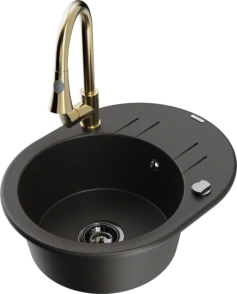 Technické údaje: Kuchyňský dřez: Rozměry: 586x458x190 mm Hloubka komory: 180 mm Šířka komory: 378x374 mm Průměr odtoku: ø90 mm Typ: 1 dřez s krátkým odkapávačem Typ: Zapuštěný Barva: Černá/Zlatá metalíza Povrchová úprava sifonu: Černá Materiál: Žula (80 % žulového kameniva, 20 % pryskyřic) Přepadový otvor: Ano Otvory: (bateriové, automatické) 2 Instalace: Univerzální, lze instalovat s odtokem na levé nebo pravé straně Vysoká odolnost proti poškrábání a zabarvení Odolnost proti tepelným šokům Snadno čistitelný povrch Dva další frézované otvory pro samoděrování ø35 Kuchyňská baterie: Materiál: Mosaz Barva: Zlatá Hlava: Keramika Provzdušňovač: Ano Typ: Jednopákový Výška baterie: 380 mm Dosah výtoku: 252 mm Typ výtoku: Výsuvný