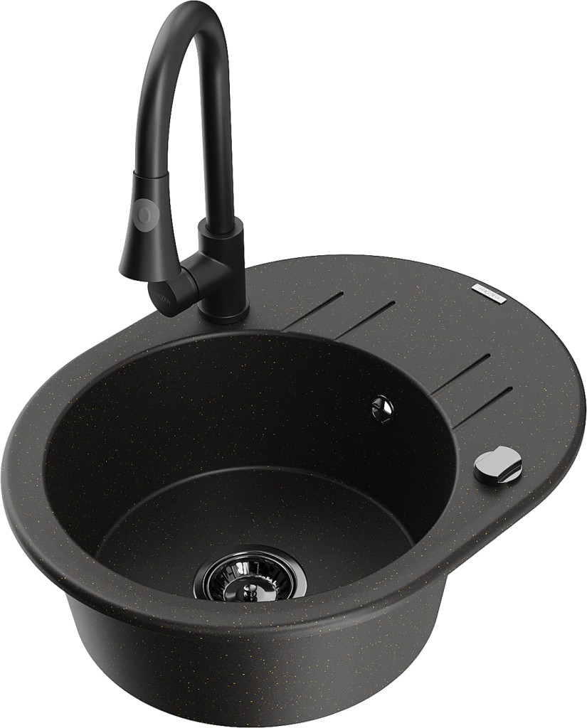 Technické údaje: Kuchyňský dřez: Rozměry: 586x458x190 mm Hloubka komory: 180 mm Šířka komory: 378x374 mm Průměr odtoku: ø90 mm Typ: 1 dřez s krátkým odkapávačem Typ: Zapuštěný Barva: Černá/Zlatá metalíza Povrchová úprava sifonu: Černá Materiál: Žula (80 % žulového kameniva, 20 % pryskyřic) Přepadový otvor: Ano Otvory: (bateriové, automatické) 2 Instalace: Univerzální, lze instalovat s odtokem na levé nebo pravé straně Vysoká odolnost proti poškrábání a zabarvení Odolnost proti tepelným šokům Snadno čistitelný povrch Dva další frézované otvory pro samoděrování ø35 Kuchyňská baterie: Materiál: Mosaz Barva: Černá Hlava: Keramika Provzdušňovač: Ano Typ: Jednopákový Výška baterie: 380 mm Dosah výtoku: 252 mm Typ výtoku: Výsuvný