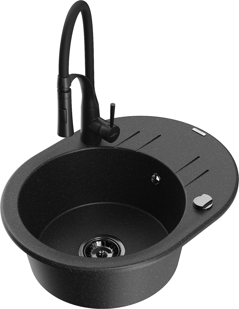 Technická data: dřez: Rozměr: 586 x 458 x 190 mm Hloubka komory: 180 mm Šířka komory: 378x374 mm Průměr odtoku: ø90 mm Typ: 1-miska s krátkým odkapávačem Typ: Zapuštěné do pracovní desky Barva: černá/stříbrná metalíza Povrchová úprava sifonu: černá Materiál: žula (80 % žulové kamenivo, 20 % pryskyřice) Přepadový otvor: Ano Otvory: (baterie, automatické) 2 Instalace: Univerzální, lze instalovat s odkapávačem na levou nebo pravou stranu Vysoká odolnost proti poškrábání a změně barvy Odolnost proti tepelným šokům Snadno čistitelný povrch Dva dodatečné vyfrézované otvory pro samoděrování ø35 kuchyňská baterie: Materiál: mosaz Černá barva Hlava: Keramická Provzdušňovač: Ano Typ hubice: Flexibilní s mosazným držákem Typ: Jedna páka Výška baterie: 430 mm Rozsah výtoku: 235 mm