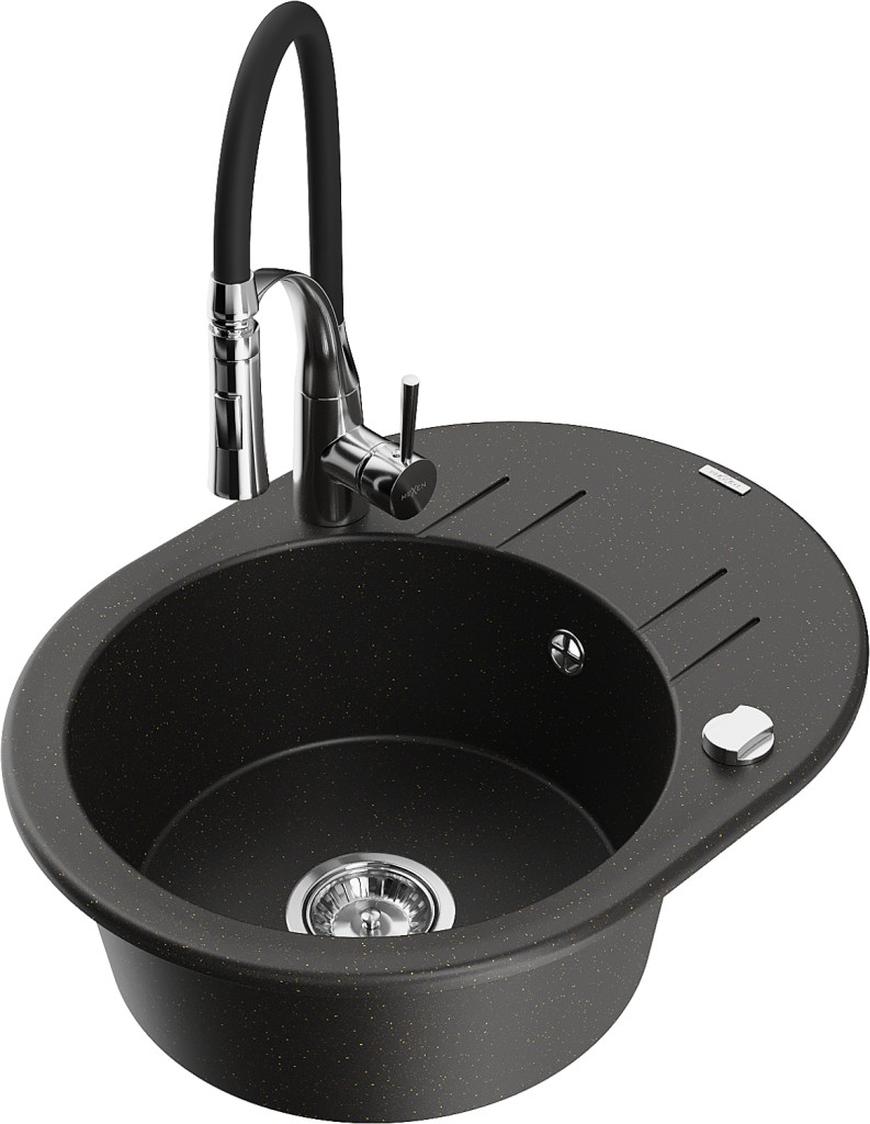 Technické údaje: Kuchyňský dřez: Rozměry: 586x458x190 mm Hloubka komory: 180 mm Šířka komory: 378x374 mm Průměr odtoku: ø90 mm Typ: 1 dřez s krátkým odkapávačem Typ: Zapuštěný Barva: Černá/Zlatá metalíza Povrchová úprava sifonu: Chrom Materiál: Žula (80 % žulového kameniva, 20 % pryskyřic) Přepadový otvor: Ano Otvory: (bateriové, automatické) 2 Instalace: Univerzální, lze instalovat s odtokem na levé nebo pravé straně Vysoká odolnost proti poškrábání a zabarvení Odolnost proti tepelným šokům Snadno čistitelný povrch Dva další frézované otvory pro samoděrování ø35 Kuchyňská baterie: Materiál: Mosaz Barva: Chrom/Černá Hlava: Keramika Provzdušňovač: Ano Typ výtoku: Flexibilní s mosaznou podpěrou Typ: Jednopákový Výška baterie: 430 mm Dosah výtoku: 235 mm