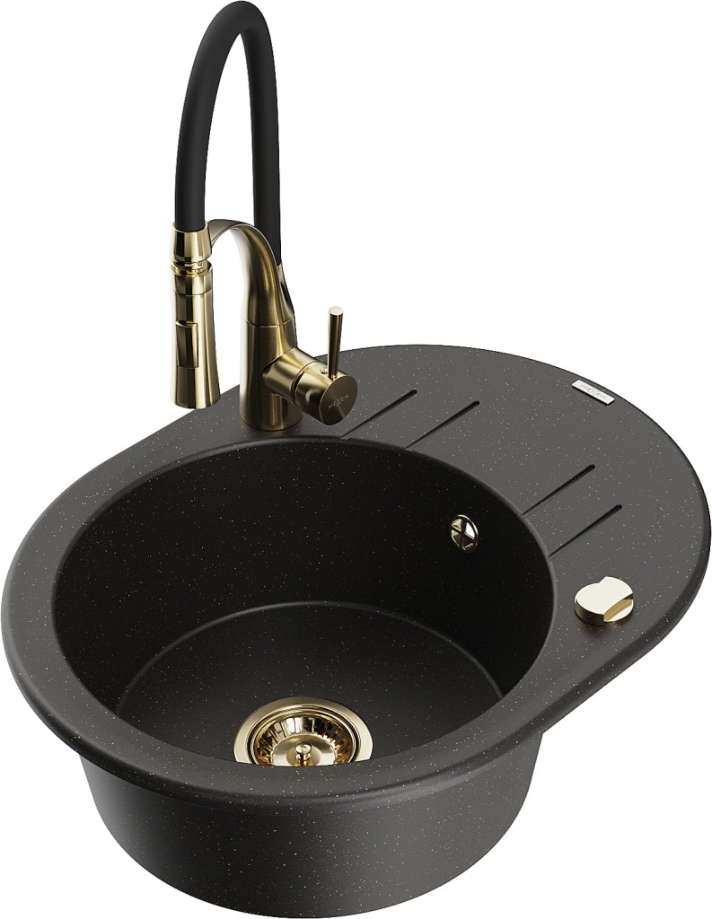 Technické údaje: Kuchyňský dřez: Rozměry: 586x458x190 mm Hloubka komory: 180 mm Šířka komory: 378x374 mm Průměr odtoku: ø90 mm Typ: 1 dřez s krátkým odkapávačem Typ: Zapuštěný Barva: Černá/Zlatá metalíza Povrchová úprava sifonu: Zlatá Materiál: Žula (80 % žulového kameniva, 20 % pryskyřic) Přepadový otvor: Ano Otvory: (bateriové, automatické) 2 Instalace: Univerzální, lze instalovat s odtokem na levé nebo pravé straně Vysoká odolnost proti poškrábání a zabarvení Odolnost proti tepelným šokům Snadno čistitelný povrch Dva další frézované otvory pro samoděrování ø35 Kuchyňská baterie: Materiál: Mosaz Barva: Zlatá/Černá Hlava: Keramika Provzdušňovač: Ano Typ výtoku: Flexibilní s mosaznou podpěrou Typ: Jednopákový Výška baterie: 430 mm Dosah výtoku: 235 mm