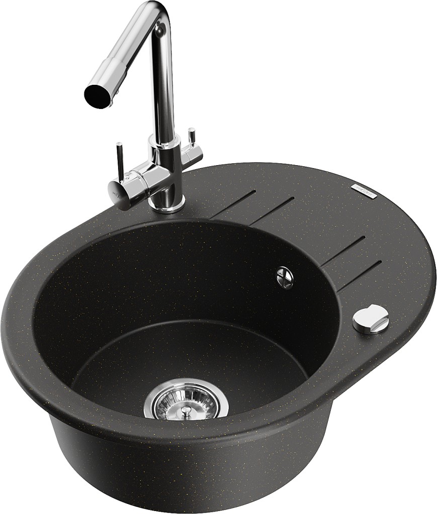 Technická data: dřez: Rozměr: 586 x 458 x 190 mm Hloubka komory: 180 mm Šířka komory: 378x374 mm Průměr odtoku: ø90 mm Typ: 1-miska s krátkým odkapávačem Typ: Zapuštěné do pracovní desky Barva: černá/zlatá metalíza Povrchová úprava sifonu: Chrome Materiál: žula (80 % žulové kamenivo, 20 % pryskyřice) Přepadový otvor: Ano Otvory: (baterie, automatické) 2 Instalace: Univerzální, lze instalovat s odkapávačem na levou nebo pravou stranu Vysoká odolnost proti poškrábání a změně barvy Odolnost proti tepelným šokům Snadno čistitelný povrch Dva dodatečné vyfrézované otvory pro samoděrování ø35 kuchyňská baterie: Materiál: mosaz Barva: Chrome Hlava: Keramická Provzdušňovač: Ano Typ: Dvě rukojeti Rozsah výtoku: 235 mm Výška baterie: 315 mm Dvouhlavá baterie s přídavným kanálem pro filtrovanou pitnou vodu