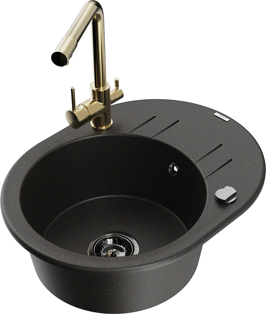 Technická data: dřez: Rozměr: 586 x 458 x 190 mm Hloubka komory: 180 mm Šířka komory: 378x374 mm Průměr odtoku: ø90 mm Typ: 1-miska s krátkým odkapávačem Typ: Zapuštěné do pracovní desky Barva: černá/zlatá metalíza Povrchová úprava sifonu: černá Materiál: žula (80 % žulové kamenivo, 20 % pryskyřice) Přepadový otvor: Ano Otvory: (baterie, automatické) 2 Instalace: Univerzální, lze instalovat s odkapávačem na levou nebo pravou stranu Vysoká odolnost proti poškrábání a změně barvy Odolnost proti tepelným šokům Snadno čistitelný povrch Dva dodatečné vyfrézované otvory pro samoděrování ø35 kuchyňská baterie: Materiál: mosaz Barva: Zlatá Hlava: Keramická Provzdušňovač: Ano Typ: Dvě rukojeti Rozsah výtoku: 235 mm Výška baterie: 315 mm Dvouhlavá baterie s přídavným kanálem pro filtrovanou pitnou vodu