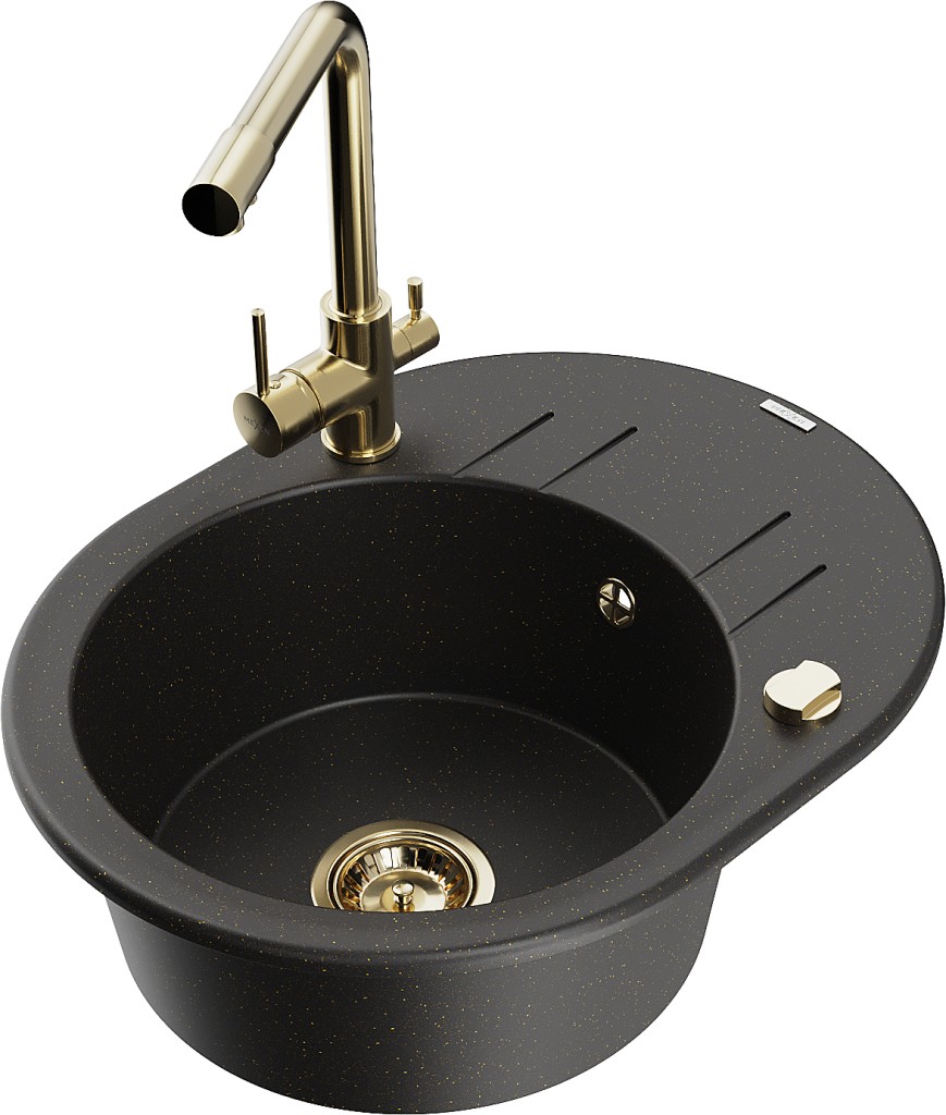 Technická data: dřez: Rozměr: 586 x 458 x 190 mm Hloubka komory: 180 mm Šířka komory: 378x374 mm Průměr odtoku: ø90 mm Typ: 1-miska s krátkým odkapávačem Typ: Zapuštěné do pracovní desky Barva: černá/zlatá metalíza Povrchová úprava sifonu: zlatá Materiál: žula (80 % žulové kamenivo, 20 % pryskyřice) Přepadový otvor: Ano Otvory: (baterie, automatické) 2 Instalace: Univerzální, lze instalovat s odkapávačem na levou nebo pravou stranu Vysoká odolnost proti poškrábání a změně barvy Odolnost proti tepelným šokům Snadno čistitelný povrch Dva dodatečné vyfrézované otvory pro samoděrování ø35 kuchyňská baterie: Materiál: mosaz Barva: Zlatá Hlava: Keramická Provzdušňovač: Ano Typ: Dvě rukojeti Rozsah výtoku: 235 mm Výška baterie: 315 mm Dvouhlavá baterie s přídavným kanálem pro filtrovanou pitnou vodu