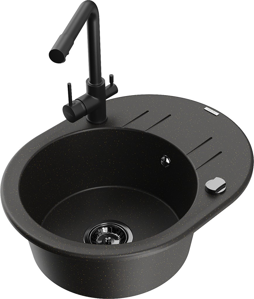 Technická data: dřez: Rozměr: 586 x 458 x 190 mm Hloubka komory: 180 mm Šířka komory: 378x374 mm Průměr odtoku: ø90 mm Typ: 1-miska s krátkým odkapávačem Typ: Zapuštěné do pracovní desky Barva: černá/zlatá metalíza Povrchová úprava sifonu: černá Materiál: žula (80 % žulové kamenivo, 20 % pryskyřice) Přepadový otvor: Ano Otvory: (baterie, automatické) 2 Instalace: Univerzální, lze instalovat s odkapávačem na levou nebo pravou stranu Vysoká odolnost proti poškrábání a změně barvy Odolnost proti tepelným šokům Snadno čistitelný povrch Dva dodatečné vyfrézované otvory pro samoděrování ø35 kuchyňská baterie: Materiál: mosaz Černá barva Hlava: Keramická Provzdušňovač: Ano Typ: Dvě rukojeti Rozsah výtoku: 235 mm Výška baterie: 315 mm Dvouhlavá baterie s přídavným kanálem pro filtrovanou pitnou vodu