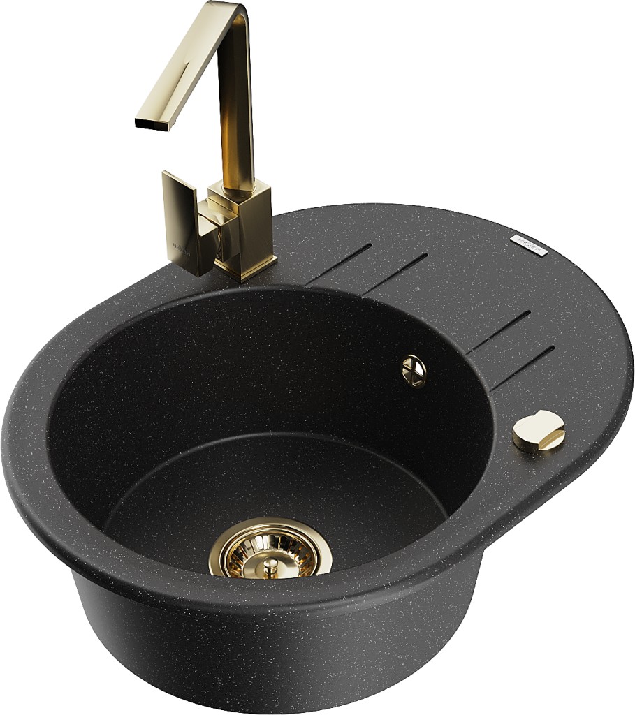 Technická data: dřez: Rozměr: 586 x 458 x 190 mm Hloubka komory: 180 mm Šířka komory: 378x374 mm Průměr odtoku: ø90 mm Typ: 1-miska s krátkým odkapávačem Typ: Zapuštěné do pracovní desky Barva: černá/stříbrná metalíza Povrchová úprava sifonu: zlatá Materiál: žula (80 % žulové kamenivo, 20 % pryskyřice) Přepadový otvor: Ano Otvory: (baterie, automatické) 2 Instalace: Univerzální, lze instalovat s odkapávačem na levou nebo pravou stranu Vysoká odolnost proti poškrábání a změně barvy Odolnost proti tepelným šokům Snadno čistitelný povrch Jeden dodatečný vyfrézovaný otvor pro samoděrování ø35 kuchyňská baterie: Materiál: mosaz Barva: Zlatá Hlava: Keramická Provzdušňovač: Ano Typ: Jedna páka Výška baterie: 290 mm Rozsah výtoku: 220 mm