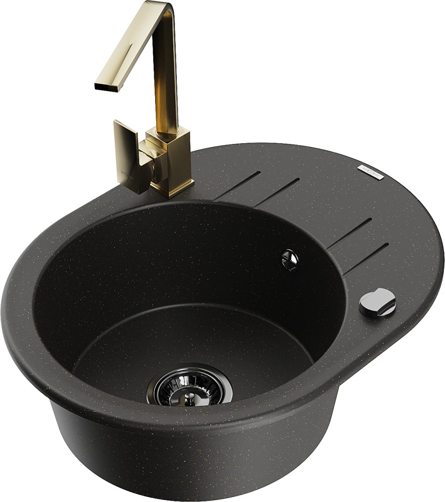 Technická data: dřez: Rozměr: 586 x 458 x 190 mm Hloubka komory: 180 mm Šířka komory: 378x374 mm Průměr odtoku: ø90 mm Typ: 1-miska s krátkým odkapávačem Typ: Zapuštěné do pracovní desky Barva: černá/zlatá metalíza Povrchová úprava sifonu: černá Materiál: žula (80 % žulové kamenivo, 20 % pryskyřice) Přepadový otvor: Ano Otvory: (baterie, automatické) 2 Instalace: Univerzální, lze instalovat s odkapávačem na levou nebo pravou stranu Vysoká odolnost proti poškrábání a změně barvy Odolnost proti tepelným šokům Snadno čistitelný povrch Jeden dodatečný vyfrézovaný otvor pro samoděrování ø35 kuchyňská baterie: Materiál: mosaz Barva: Zlatá Hlava: Keramická Provzdušňovač: Ano Typ: Jedna páka Výška baterie: 290 mm Rozsah výtoku: 220 mm