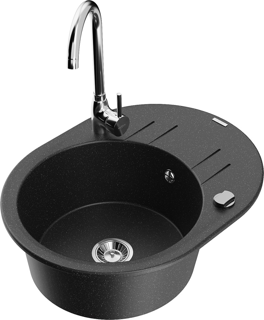Technická data: dřez: Rozměr: 586 x 458 x 190 mm Hloubka komory: 180 mm Šířka komory: 378x374 mm Průměr odtoku: ø90 mm Typ: 1-miska s krátkým odkapávačem Typ: Zapuštěné do pracovní desky Barva: černá/stříbrná metalíza Povrchová úprava sifonu: Chrome Materiál: žula (80 % žulové kamenivo, 20 % pryskyřice) Přepadový otvor: Ano Otvory: (baterie, automatické) 2 Instalace: Univerzální, lze instalovat s odkapávačem na levou nebo pravou stranu Vysoká odolnost proti poškrábání a změně barvy Odolnost proti tepelným šokům Snadno čistitelný povrch Jeden dodatečný vyfrézovaný otvor pro samoděrování ø35 kuchyňská baterie: Materiál: mosaz Barva: Chrome Hlava: Keramická Provzdušňovač: Ano Typ: Jedna páka Výška baterie: 335 mm Rozsah výtoku: 180 mm