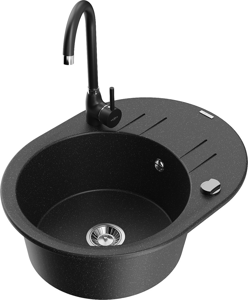 Technická data: dřez: Rozměr: 586 x 458 x 190 mm Hloubka komory: 180 mm Šířka komory: 378x374 mm Průměr odtoku: ø90 mm Typ: 1-miska s krátkým odkapávačem Typ: Zapuštěné do pracovní desky Barva: černá/stříbrná metalíza Povrchová úprava sifonu: Chrome Materiál: žula (80 % žulové kamenivo, 20 % pryskyřice) Přepadový otvor: Ano Otvory: (baterie, automatické) 2 Instalace: Univerzální, lze instalovat s odkapávačem na levou nebo pravou stranu Vysoká odolnost proti poškrábání a změně barvy Odolnost proti tepelným šokům Snadno čistitelný povrch Jeden dodatečný vyfrézovaný otvor pro samoděrování ø35 kuchyňská baterie: Materiál: mosaz Černá barva Hlava: Keramická Provzdušňovač: Ano Typ: Jedna páka Výška baterie: 335 mm Rozsah výtoku: 180 mm