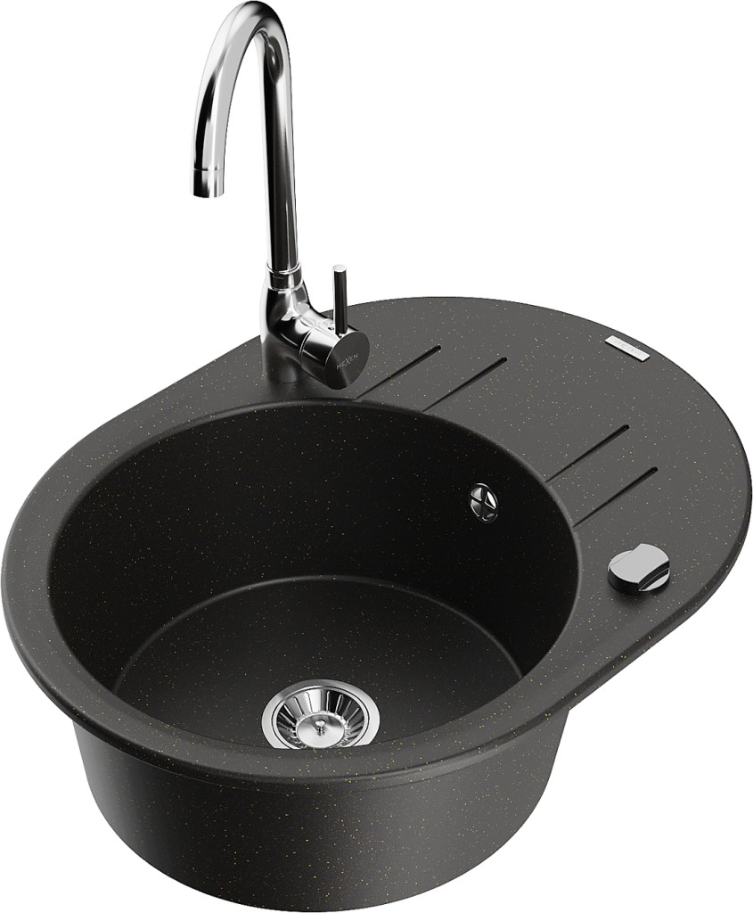 Technická data: dřez: Rozměr: 586 x 458 x 190 mm Hloubka komory: 180 mm Šířka komory: 378x374 mm Průměr odtoku: ø90 mm Typ: 1-miska s krátkým odkapávačem Typ: Zapuštěné do pracovní desky Barva: černá/zlatá metalíza Povrchová úprava sifonu: Chrome Materiál: žula (80 % žulové kamenivo, 20 % pryskyřice) Přepadový otvor: Ano Otvory: (baterie, automatické) 2 Instalace: Univerzální, lze instalovat s odkapávačem na levou nebo pravou stranu Vysoká odolnost proti poškrábání a změně barvy Odolnost proti tepelným šokům Snadno čistitelný povrch Jeden dodatečný vyfrézovaný otvor pro samoděrování ø35 kuchyňská baterie: Materiál: mosaz Barva: Chrome Hlava: Keramická Provzdušňovač: Ano Typ: Jedna páka Výška baterie: 335 mm Rozsah výtoku: 180 mm