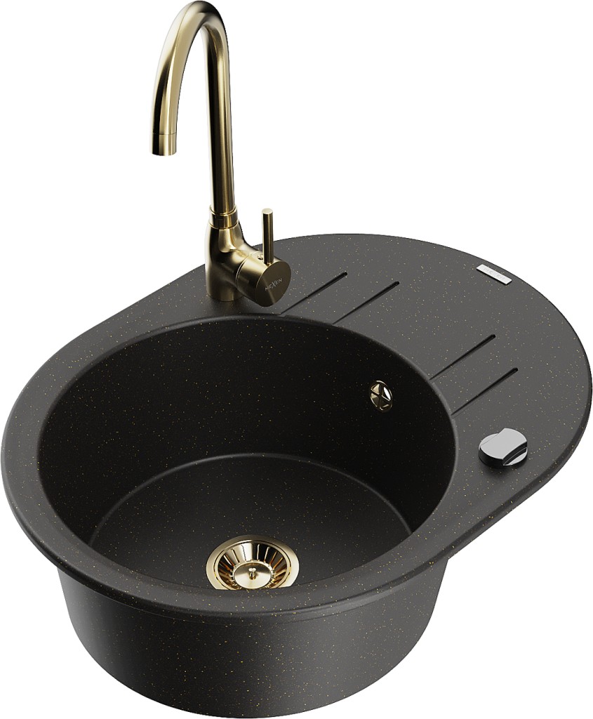 Technická data: dřez: Rozměr: 586 x 458 x 190 mm Hloubka komory: 180 mm Šířka komory: 378x374 mm Průměr odtoku: ø90 mm Typ: 1-miska s krátkým odkapávačem Typ: Zapuštěné do pracovní desky Barva: černá/zlatá metalíza Povrchová úprava sifonu: zlatá Materiál: žula (80 % žulové kamenivo, 20 % pryskyřice) Přepadový otvor: Ano Otvory: (baterie, automatické) 2 Instalace: Univerzální, lze instalovat s odkapávačem na levou nebo pravou stranu Vysoká odolnost proti poškrábání a změně barvy Odolnost proti tepelným šokům Snadno čistitelný povrch Jeden dodatečný vyfrézovaný otvor pro samoděrování ø35 kuchyňská baterie: Materiál: mosaz Barva: Zlatá Hlava: Keramická Provzdušňovač: Ano Typ: Jedna páka Výška baterie: 335 mm Rozsah výtoku: 180 mm