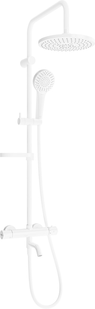 Technická data: Materiál sloupku: Nerezová ocel, ABS Povrchová úprava sloupku: Bílá Výška: 970 mm Šířka sloupku: 22 mm Vzdálenost od stěny: 400 mm Miska na mýdlo Posuvný držák na sluchátko Nastavitelné montážní držáky Materiál dešťové sprchy: Plast Povrchová úprava dešťové sprchy: Bílá Rozměr dešťové sprchy: ø225 mm Materiál sluchátek: Plast Povrchová úprava sluchátek: Bílá Počet funkcí: 3 Materiál hadice: PVC Hadí provedení: Bílá Délka hadice: 150 cm Mosazné hroty Hladký povrch usnadňuje údržbu Otočné hroty zabraňují kroucení Pružný materiál odolný proti roztahování a ohýbání Materiál baterie: Mosazné tělo Povrchová úprava baterie: Bílá Typ výtoku: Mobilní Hlava: Termostatická Připojení: G3 / 4" (nahoře) a G1 / 2" (dole) Připojení Rostav: 150 mm Blokování horké vody při 38 °C