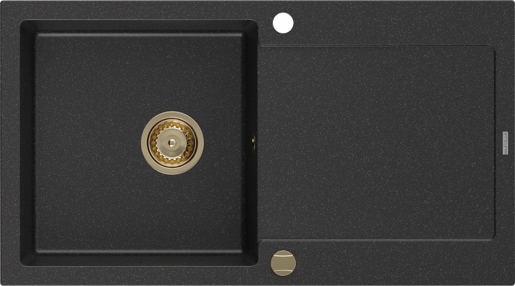 Technická data: Rozměr: 900x500x190mm Hloubka komory: 180 mm Rozměry komory: 430x415 mm Průměr odtoku: ø90 mm Typ: 1-miska s odkapávačem Typ: Zapuštěné do pracovní desky Materiál: žula Barva: černá/stříbrná metalíza Povrchová úprava sifonu: zlatá Přepadový otvor: Ano Otvor pro baterii: Ano Včetně automatického sifonu Vysoká odolnost proti poškrábání a změně barvy Odolnost proti tepelným šokům Snadno čistitelný povrch Dva dodatečné vyfrézované otvory pro samoděrování ø35