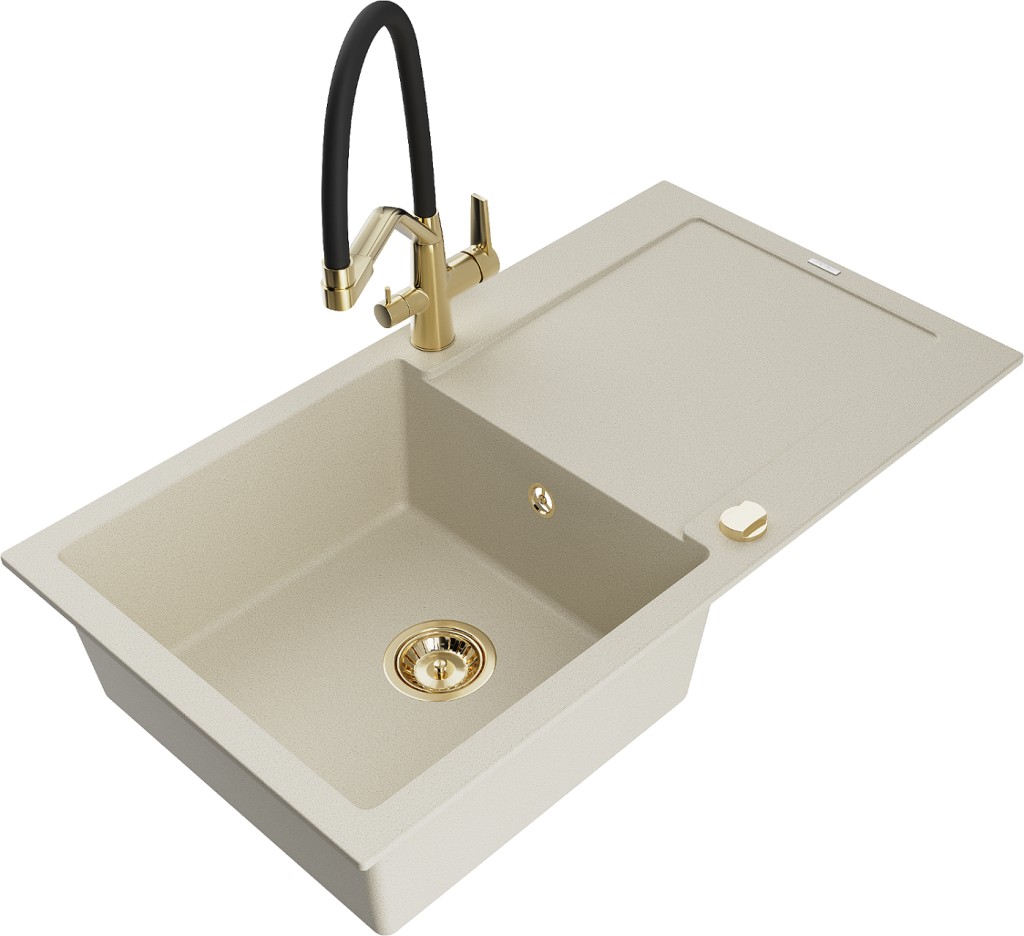 Technická data: dřez: Rozměr: 900x500x190mm Hloubka komory: 180 mm Rozměry komory: 430x415 mm Průměr odtoku: ø90 mm Typ: 1-miska s odkapávačem Typ: Zapuštěné do pracovní desky Barva béžová Povrchová úprava sifonu: zlatá Materiál: žula (80 % žulové kamenivo, 20 % pryskyřice) Přepadový otvor: Ano Otvory: (baterie, automatické) 2 Instalace: Univerzální, lze instalovat s odkapávačem na levou nebo pravou stranu Vysoká odolnost proti poškrábání a změně barvy Odolnost proti tepelným šokům Snadno čistitelný povrch Dva dodatečné vyfrézované otvory pro samoděrování ø35 kuchyňská baterie: Materiál: mosaz Povrchová úprava: zlatá/černá Hlavy: Keramické Provzdušňovač: Ano Typ hubice: Flexibilní s mosazným držákem Rozsah výtoku: 260 mm Výška: 405 mm Typ: Dvě rukojeti Dvouhlavá baterie s přídavným kanálem pro filtrovanou pitnou vodu