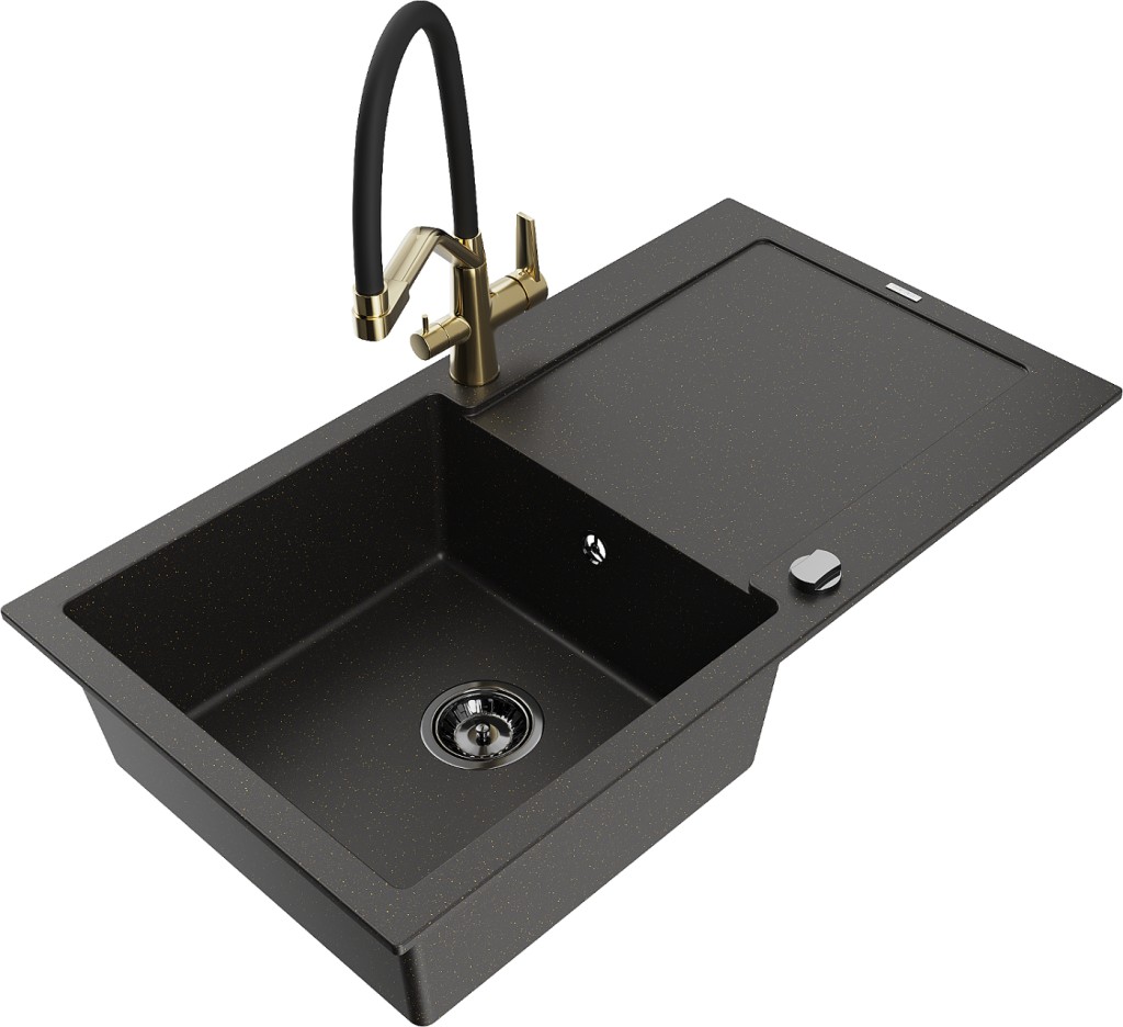 Technická data: dřez: Rozměr: 900x500x190mm Hloubka komory: 180 mm Rozměry komory: 430x415 mm Průměr odtoku: ø90 mm Typ: 1-miska s odkapávačem Typ: Zapuštěné do pracovní desky Barva: černá/zlatá metalíza Povrchová úprava sifonu: černá Materiál: žula (80 % žulové kamenivo, 20 % pryskyřice) Přepadový otvor: Ano Otvory: (baterie, automatické) 2 Instalace: Univerzální, lze instalovat s odkapávačem na levou nebo pravou stranu Vysoká odolnost proti poškrábání a změně barvy Odolnost proti tepelným šokům Snadno čistitelný povrch Dva dodatečné vyfrézované otvory pro samoděrování ø35 kuchyňská baterie: Materiál: mosaz Povrchová úprava: zlatá/černá Hlavy: Keramické Provzdušňovač: Ano Typ hubice: Flexibilní s mosazným držákem Rozsah výtoku: 260 mm Výška: 405 mm Typ: Dvě rukojeti Dvouhlavá baterie s přídavným kanálem pro filtrovanou pitnou vodu