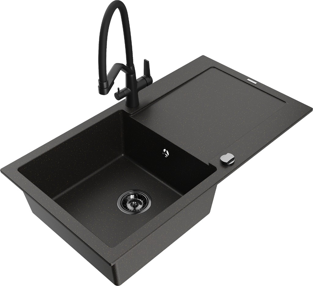 Technická data: dřez: Rozměr: 900x500x190mm Hloubka komory: 180 mm Rozměry komory: 430x415 mm Průměr odtoku: ø90 mm Typ: 1-miska s odkapávačem Typ: Zapuštěné do pracovní desky Barva: černá/zlatá metalíza Povrchová úprava sifonu: černá Materiál: žula (80 % žulové kamenivo, 20 % pryskyřice) Přepadový otvor: Ano Otvory: (baterie, automatické) 2 Instalace: Univerzální, lze instalovat s odkapávačem na levou nebo pravou stranu Vysoká odolnost proti poškrábání a změně barvy Odolnost proti tepelným šokům Snadno čistitelný povrch Dva dodatečné vyfrézované otvory pro samoděrování ø35 kuchyňská baterie: Materiál: mosaz Povrchová úprava: černá Hlavy: Keramické Provzdušňovač: Ano Typ hubice: Flexibilní s mosazným držákem Rozsah výtoku: 260 mm Výška: 405 mm Typ: Dvě rukojeti Dvouhlavá baterie s přídavným kanálem pro filtrovanou pitnou vodu