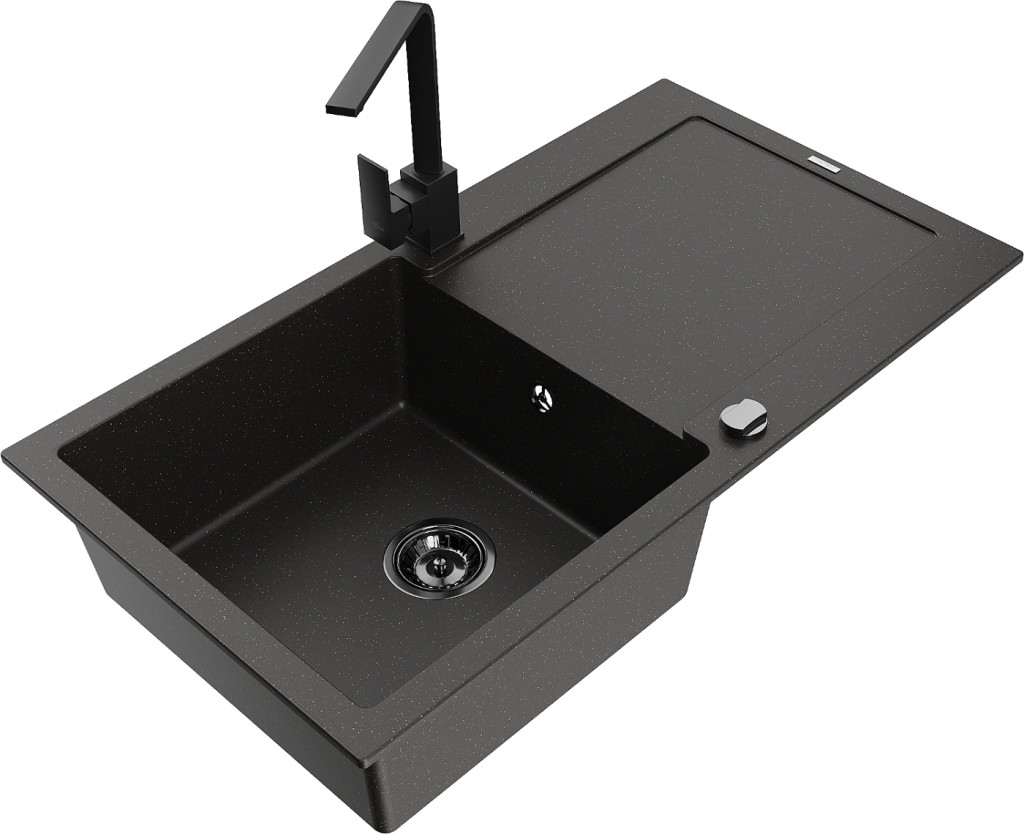 Technická data: dřez: Rozměr: 900x500x190mm Hloubka komory: 180 mm Rozměry komory: 430x415 mm Průměr odtoku: ø90 mm Typ: 1-miska s odkapávačem Typ: Zapuštěné do pracovní desky Barva: černá/zlatá metalíza Povrchová úprava sifonu: černá Materiál: žula (80 % žulové kamenivo, 20 % pryskyřice) Přepadový otvor: Ano Otvory: (baterie, automatické) 2 Instalace: Univerzální, lze instalovat s odkapávačem na levou nebo pravou stranu Vysoká odolnost proti poškrábání a změně barvy Odolnost proti tepelným šokům Snadno čistitelný povrch Dva dodatečné vyfrézované otvory pro samoděrování ø35 kuchyňská baterie: Materiál: mosaz Černá barva Hlava: Keramická Provzdušňovač: Ano Typ: Jedna páka Výška baterie: 290 mm Rozsah výtoku: 220 mm