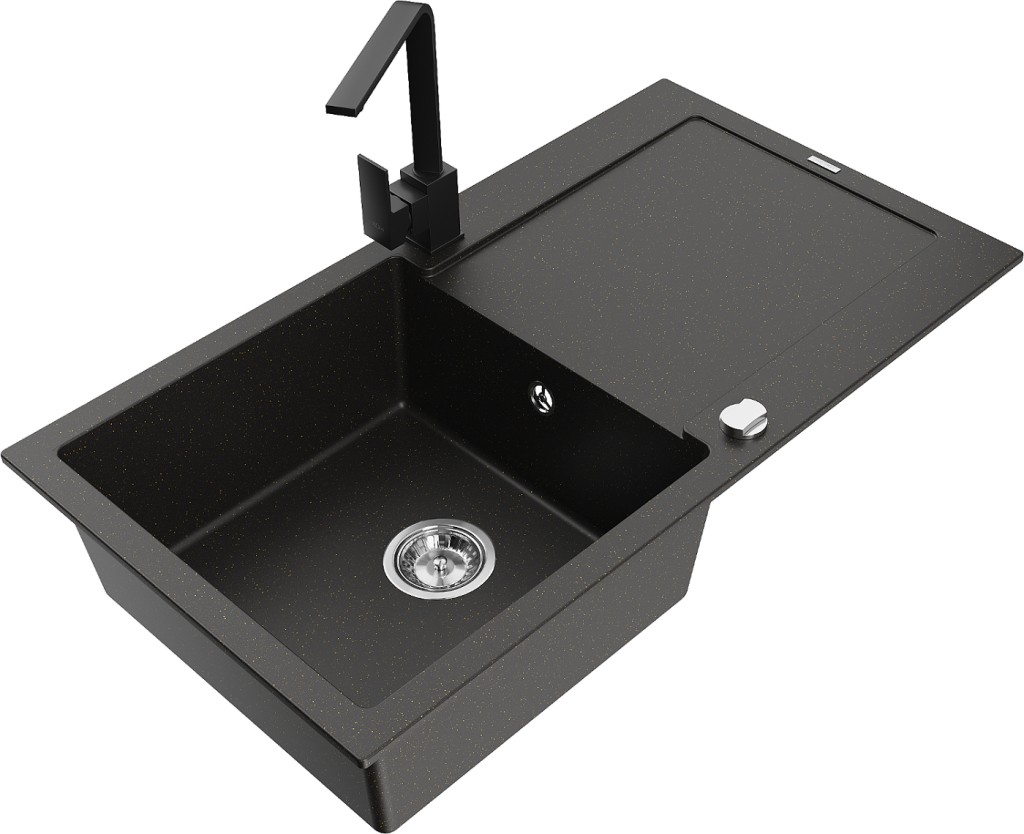 Technická data: dřez: Rozměr: 900x500x190mm Hloubka komory: 180 mm Rozměry komory: 430x415 mm Průměr odtoku: ø90 mm Typ: 1-miska s odkapávačem Typ: Zapuštěné do pracovní desky Barva: černá/zlatá metalíza Povrchová úprava sifonu: Chrome Materiál: žula (80 % žulové kamenivo, 20 % pryskyřice) Přepadový otvor: Ano Otvory: (baterie, automatické) 2 Instalace: Univerzální, lze instalovat s odkapávačem na levou nebo pravou stranu Vysoká odolnost proti poškrábání a změně barvy Odolnost proti tepelným šokům Snadno čistitelný povrch Dva dodatečné vyfrézované otvory pro samoděrování ø35 kuchyňská baterie: Materiál: mosaz Černá barva Hlava: Keramická Provzdušňovač: Ano Typ: Jedna páka Výška baterie: 290 mm Rozsah výtoku: 220 mm