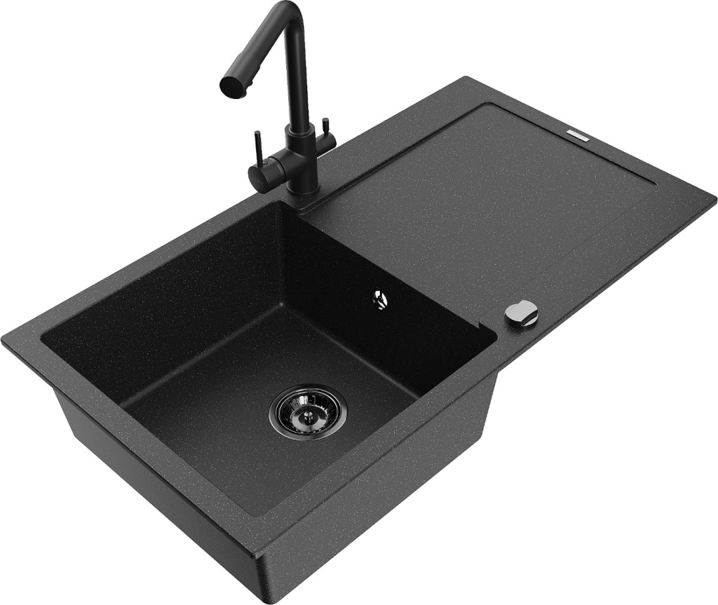 Technická data: dřez: Rozměr: 900x500x190mm Hloubka komory: 180 mm Rozměry komory: 430x415 mm Průměr odtoku: ø90 mm Typ: 1-miska s odkapávačem Typ: Zapuštěné do pracovní desky Barva: černá/stříbrná metalíza Povrchová úprava sifonu: černá Materiál: žula (80 % žulové kamenivo, 20 % pryskyřice) Přepadový otvor: Ano Otvory: (baterie, automatické) 2 Instalace: Univerzální, lze instalovat s odkapávačem na levou nebo pravou stranu Vysoká odolnost proti poškrábání a změně barvy Odolnost proti tepelným šokům Snadno čistitelný povrch Dva dodatečné vyfrézované otvory pro samoděrování ø35 kuchyňská baterie: Materiál: mosaz Černá barva Hlava: Keramická Provzdušňovač: Ano Rozsah výtoku: 235 mm Výška baterie: 315 mm Typ: Dvě rukojeti Dvouhlavá baterie s přídavným kanálem pro filtrovanou pitnou vodu