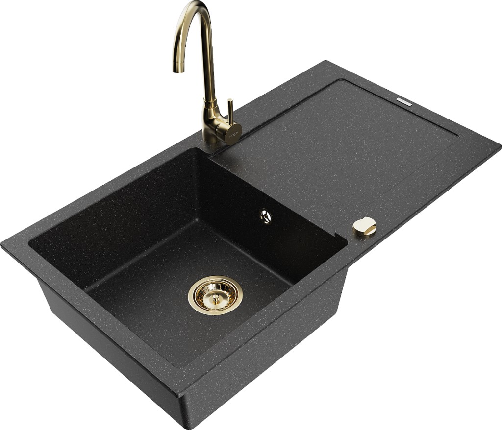 Technická data: dřez: Rozměr: 900x500x190mm Hloubka komory: 180 mm Rozměry komory: 430x415 mm Průměr odtoku: ø90 mm Typ: 1-miska s odkapávačem Typ: Zapuštěné do pracovní desky Barva: černá/stříbrná metalíza Povrchová úprava sifonu: zlatá Materiál: žula (80 % žulové kamenivo, 20 % pryskyřice) Přepadový otvor: Ano Otvory: (baterie, automatické) 2 Instalace: Univerzální, lze instalovat s odkapávačem na levou nebo pravou stranu Vysoká odolnost proti poškrábání a změně barvy Odolnost proti tepelným šokům Snadno čistitelný povrch Dva dodatečné vyfrézované otvory pro samoděrování ø35 kuchyňská baterie: Materiál: mosaz Barva: Zlatá Hlava: Keramická Provzdušňovač: Ano Typ: Jedna páka Výška baterie: 335 mm Rozsah výtoku: 180 mm