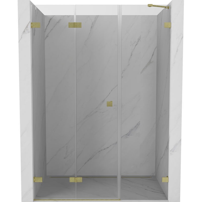 Specifikace produktu: Rozměr: 120x200 cm Strana montáže: Levá Vstup: Skládací Barva skla: Průhledná Povrchová úprava: Kartáčované zlato Profil: Hliník Typ skla: Tvrzené Tloušťka skla: dveře 6 mm, stěna 8 mm Snadno čistitelný povlak Možnost nastavení šířky Dva montážní systémy: - S profilem, který umožňuje vyrovnání nerovností stěn - Bez profilu pro dokonale rovné stěny Lze namontovat na sprchovou vaničku nebo dlaždice Mosazné spony a panty v jedné rovině se skleněnou tabulí Magnetický proužek a elastomerová těsnění pro odvod vody Hliníkový práh pro těsnění dveří