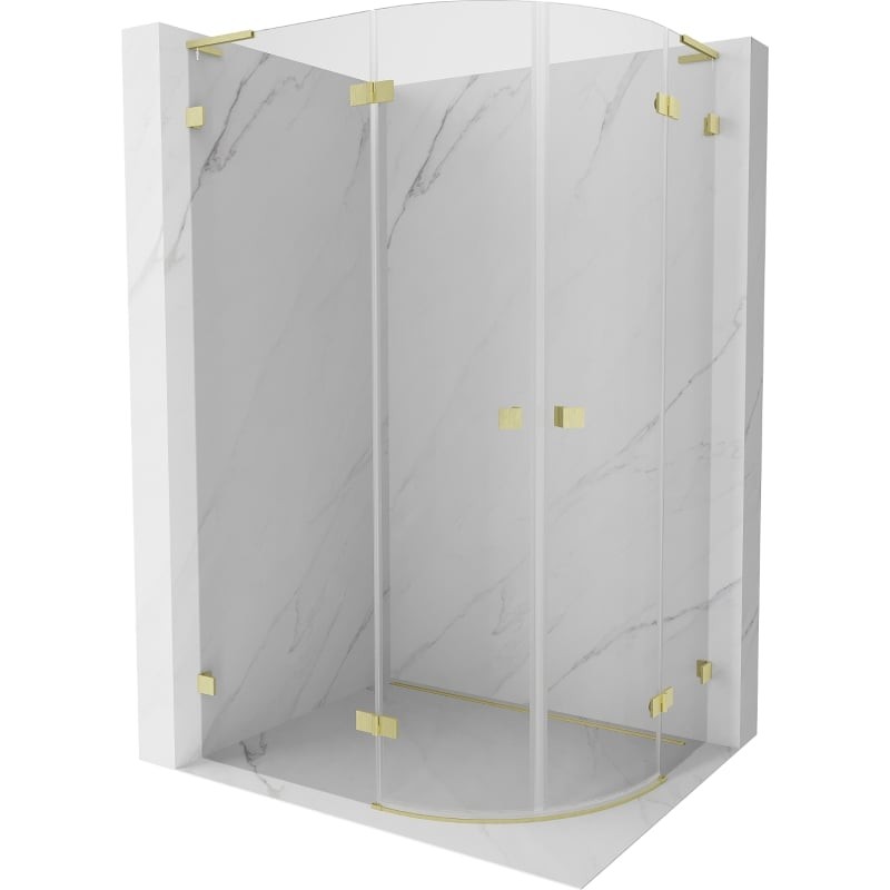 Specifikace produktu: Rozměr: 100x90 cm (levé dveře 100 cm, pravé dveře 90 cm) Výška: 200 cm Poloměr zaoblení R55 Strana montáže: Levá Vchod: Křídlové dveře Barva skla: Průhledná Povrchová úprava: Kartáčované zlato Profil: Hliník L-úhlový stabilizátor: nerezová ocel Typ skla: Tvrzené Tloušťka skla: 8 mm Snadno čistitelný povlak Možnost nastavení šířky Dva montážní systémy: - S profilem, který umožňuje vyrovnání nerovností stěn - Bez profilu pro dokonale rovné stěny Lze namontovat na sprchovou vaničku nebo dlaždice Mechanismus zvedání a spouštění dveří Mosazné spony a panty v jedné rovině se skleněnou tabulí Magnetický proužek a elastomerová těsnění pro odvod vody Hliníkový práh pro těsnění dveří