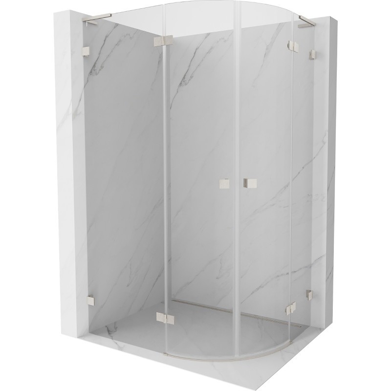 Specifikace produktu: Rozměr: 90x80 cm (levé dveře 90 cm, pravé dveře 80 cm) Výška: 200 cm Poloměr zaoblení R55 Strana montáže: Levá Vchod: Křídlové dveře Barva skla: Průhledná Povrchová úprava: Kartáčovaný nikl Profil: Hliník L-úhlový stabilizátor: nerezová ocel Typ skla: Tvrzené Tloušťka skla: 8 mm Snadno čistitelný povlak Možnost nastavení šířky Dva montážní systémy: - S profilem, který umožňuje vyrovnání nerovností stěn - Bez profilu pro dokonale rovné stěny Lze namontovat na sprchovou vaničku nebo dlaždice Mechanismus zvedání a spouštění dveří Mosazné spony a panty v jedné rovině se skleněnou tabulí Magnetický proužek a elastomerová těsnění pro odvod vody Hliníkový práh těsnění dveří
