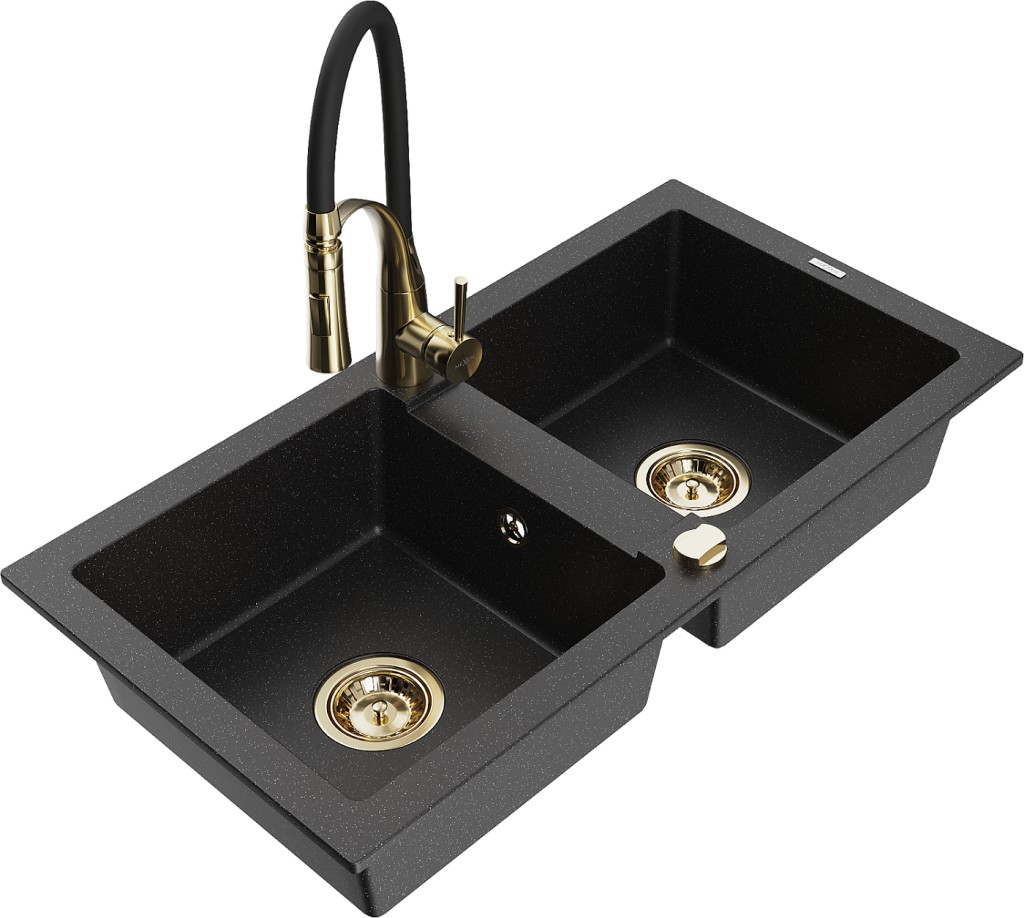 Technická data: dřez: Rozměr: 820 x 436 x 161 mm Hloubka komory: 151 mm Rozměry komory: 356x336 mm Průměr odtoku: ø90 mm Typ: 2-komorový Typ: Zapuštěné do pracovní desky Barva: černá/stříbrná metalíza Povrchová úprava sifonu: zlatá Materiál: žula (80 % žulové kamenivo, 20 % pryskyřice) Přepadový otvor: Ano Otvory: (baterie, automatické) 2 Vysoká odolnost proti poškrábání a změně barvy Odolnost proti tepelným šokům Snadno čistitelný povrch kuchyňská baterie: Materiál: mosaz Barva: Zlatá/Černá Hlava: Keramická Provzdušňovač: Ano Typ: Jedna páka Výška baterie: 430 mm Rozsah výtoku: 185 mm Baterie má výsuvný výtok