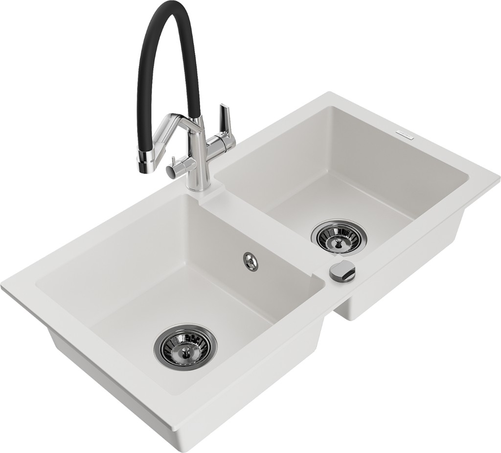 Technická data: dřez: Rozměr: 820 x 436 x 161 mm Hloubka komory: 151 mm Rozměry komory: 356x336 mm Průměr odtoku: ø90 mm Typ: 2-komorový Typ: Zapuštěné do pracovní desky bílá barva Povrchová úprava sifonu: černá Materiál: žula (80 % žulové kamenivo, 20 % pryskyřice) Přepadový otvor: Ano Otvory: (baterie, automatické) 2 Vysoká odolnost proti poškrábání a změně barvy Odolnost proti tepelným šokům Snadno čistitelný povrch kuchyňská baterie: Materiál: mosaz Povrchová úprava: chrom/černá Hlavy: Keramické Provzdušňovač: Ano Typ hubice: Flexibilní s mosazným držákem Rozsah výtoku: 260 mm Výška: 405 mm Typ: Dvě rukojeti Dvouhlavá baterie s přídavným filtrem na pitnou vodu