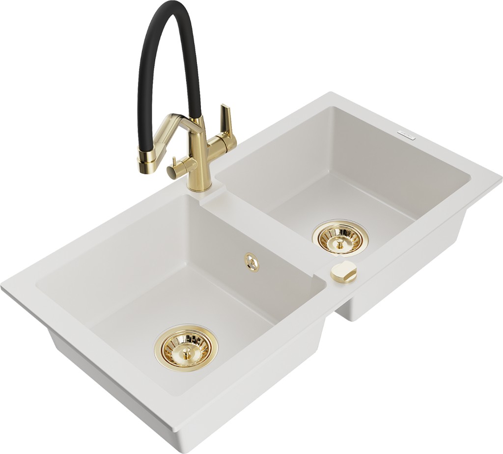 Technická data: dřez: Rozměr: 820 x 436 x 161 mm Hloubka komory: 151 mm Rozměry komory: 356x336 mm Průměr odtoku: ø90 mm Typ: 2-komorový Typ: Zapuštěné do pracovní desky bílá barva Povrchová úprava sifonu: zlatá Materiál: žula (80 % žulové kamenivo, 20 % pryskyřice) Přepadový otvor: Ano Otvory: (baterie, automatické) 2 Vysoká odolnost proti poškrábání a změně barvy Odolnost proti tepelným šokům Snadno čistitelný povrch kuchyňská baterie: Materiál: mosaz Povrchová úprava: zlatá/černá Hlavy: Keramické Provzdušňovač: Ano Typ hubice: Flexibilní s mosazným držákem Rozsah výtoku: 260 mm Výška: 405 mm Typ: Dvě rukojeti Dvouhlavá baterie s přídavným filtrem na pitnou vodu
