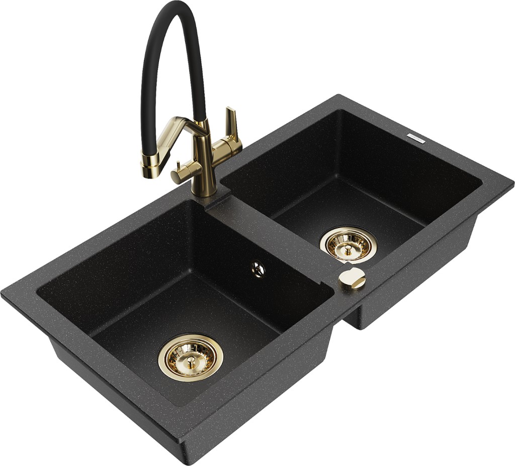 Technická data: dřez: Rozměr: 820 x 436 x 161 mm Hloubka komory: 151 mm Rozměry komory: 356x336 mm Průměr odtoku: ø90 mm Typ: 2-komorový Typ: Zapuštěné do pracovní desky Barva: černá/stříbrná metalíza Povrchová úprava sifonu: zlatá Materiál: žula (80 % žulové kamenivo, 20 % pryskyřice) Přepadový otvor: Ano Otvory: (baterie, automatické) 2 Vysoká odolnost proti poškrábání a změně barvy Odolnost proti tepelným šokům Snadno čistitelný povrch kuchyňská baterie: Materiál: mosaz Barva: Zlatá/Černá Hlavy: Keramické Provzdušňovač: Ano Typ hubice: Flexibilní s mosazným držákem Rozsah výtoku: 260 mm Výška: 405 mm Typ: Dvě rukojeti Dvouhlavá baterie s přídavným filtrem na pitnou vodu