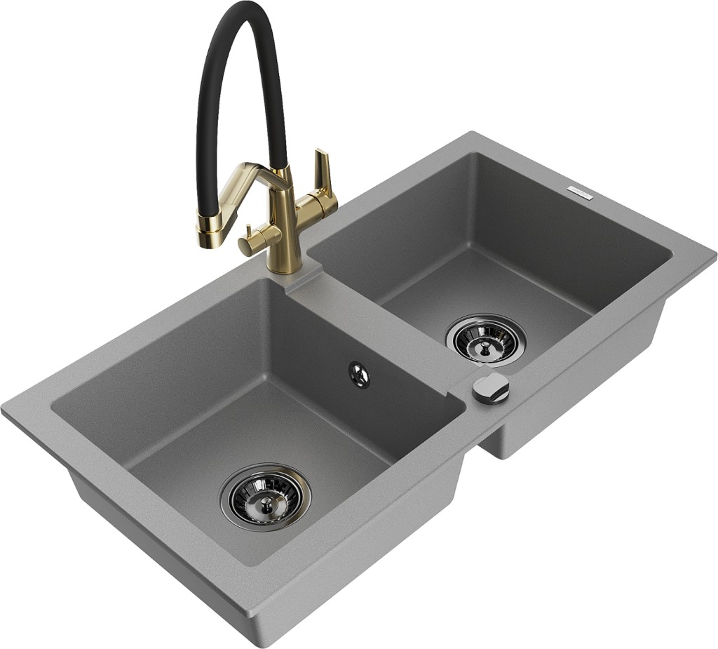 Technická data: dřez: Rozměr: 820 x 436 x 161 mm Hloubka komory: 151 mm Rozměry komory: 356x336 mm Průměr odtoku: ø90 mm Typ: 2-komorový Typ: Zapuštěné do pracovní desky Šedá barva Povrchová úprava sifonu: černá Materiál: žula (80 % žulové kamenivo, 20 % pryskyřice) Přepadový otvor: Ano Otvory: (baterie, automatické) 2 Vysoká odolnost proti poškrábání a změně barvy Odolnost proti tepelným šokům Snadno čistitelný povrch kuchyňská baterie: Materiál: mosaz Barva: Zlatá/Černá Hlavy: Keramické Provzdušňovač: Ano Typ hubice: Flexibilní s mosazným držákem Rozsah výtoku: 260 mm Výška: 405 mm Typ: Dvě rukojeti Dvouhlavá baterie s přídavným filtrem na pitnou vodu
